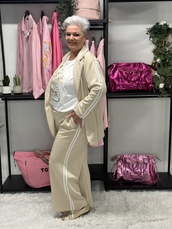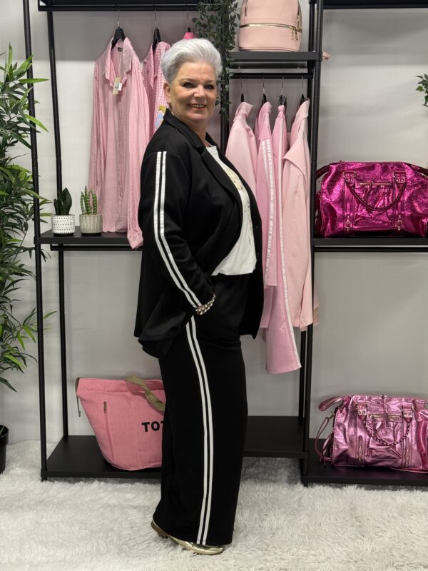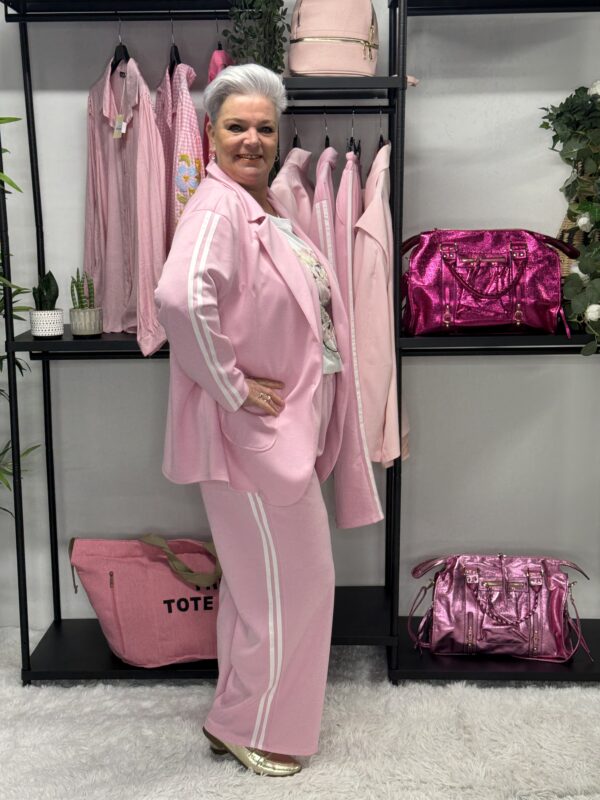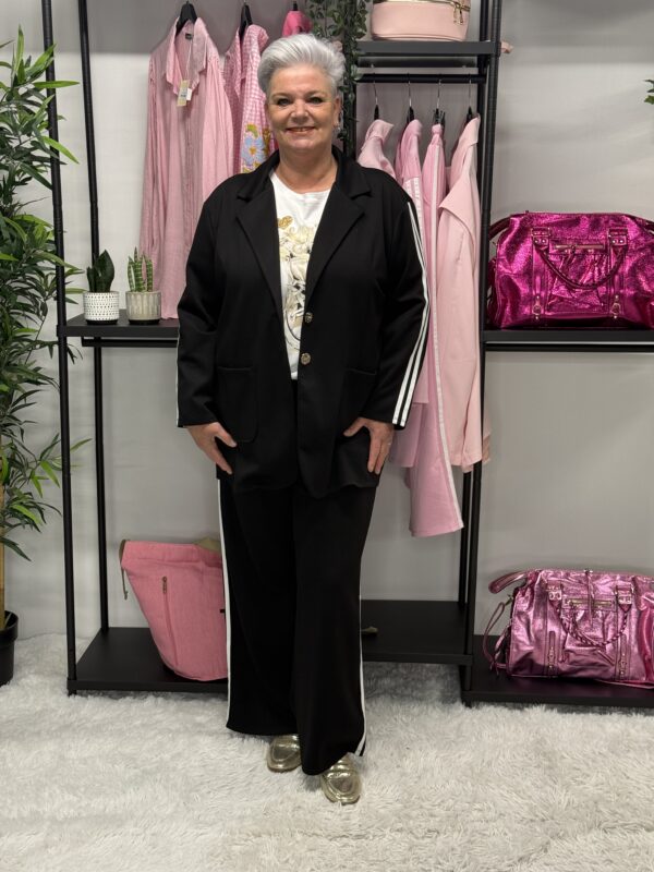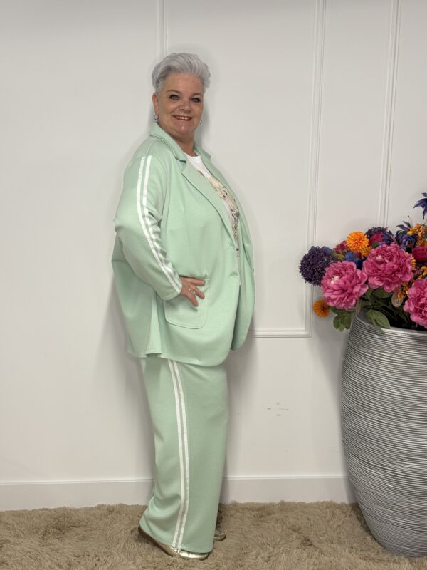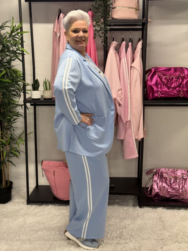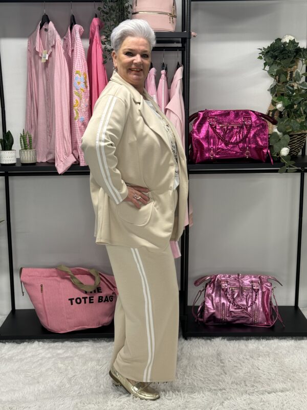 De subtiele strepen geven het pak een sportieve en moderne uitstraling. Ideaal voor een casual dagje uit, een relaxte werkdag of gewoon om comfortabel thuis te dragen — zonder in te leveren op stijl.