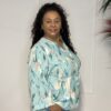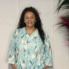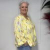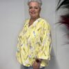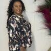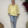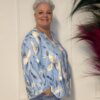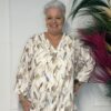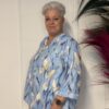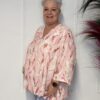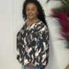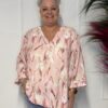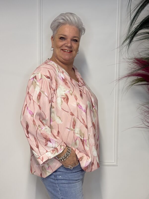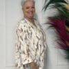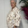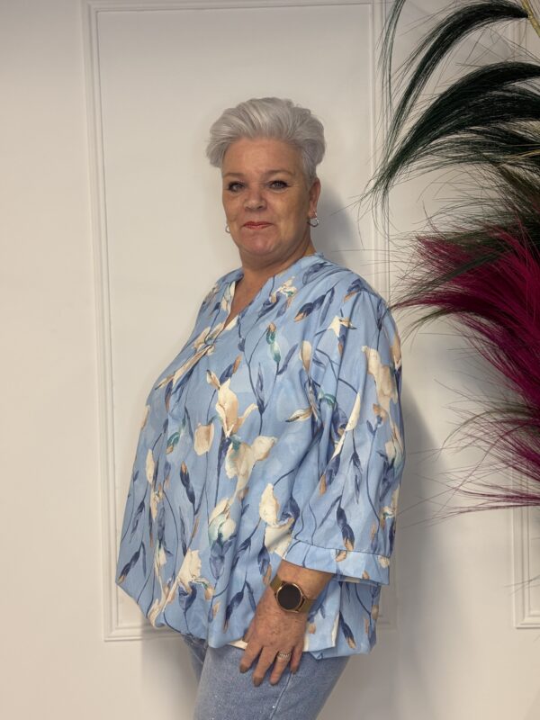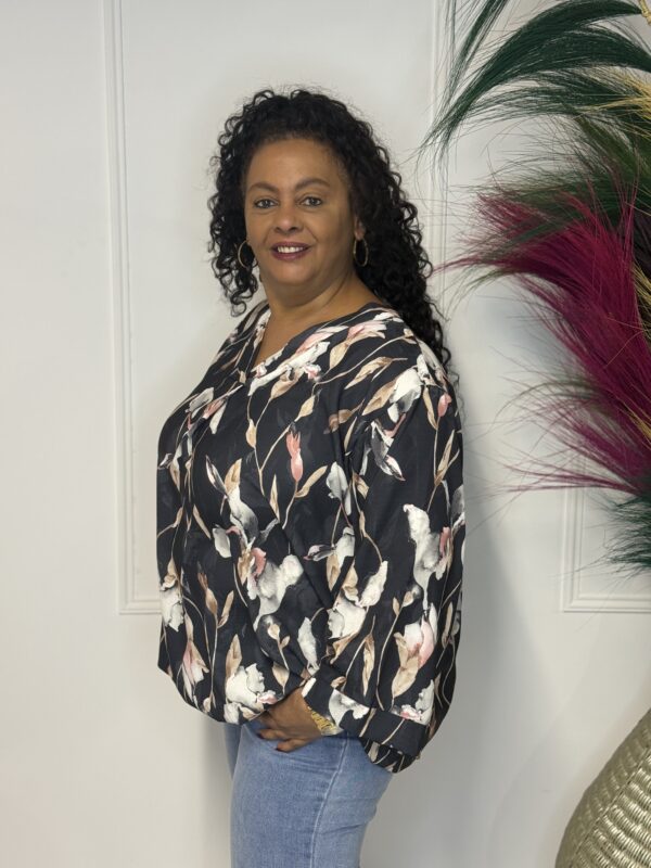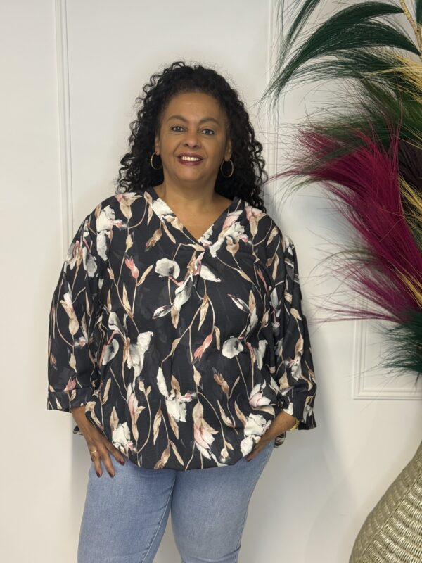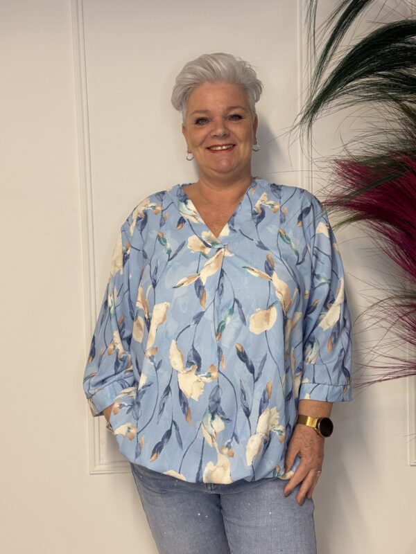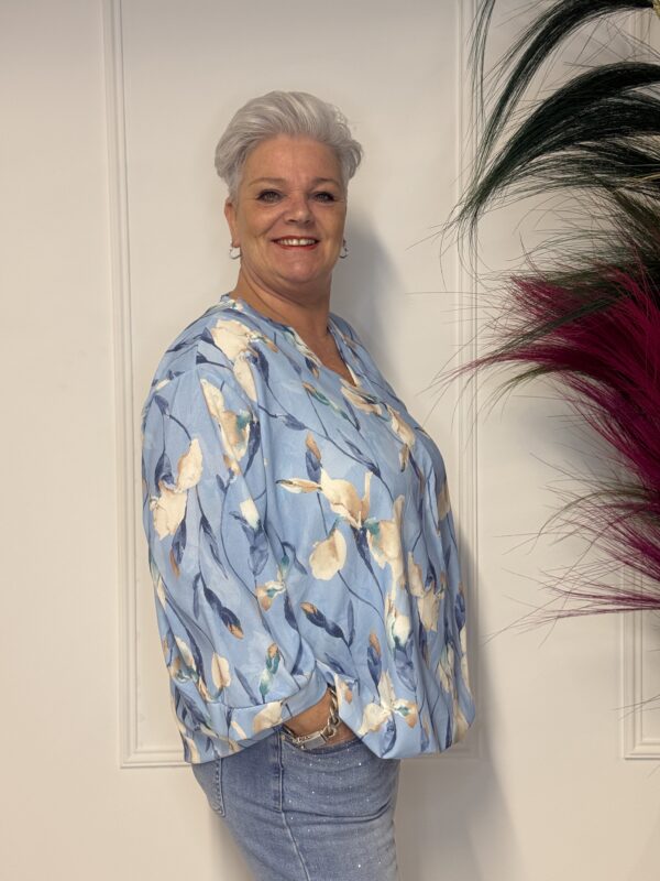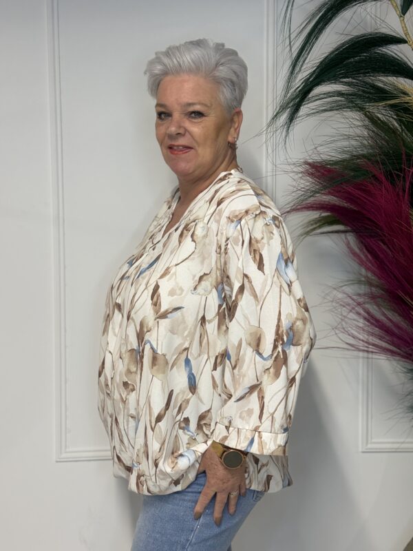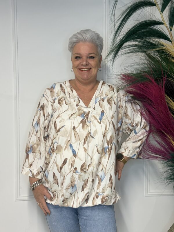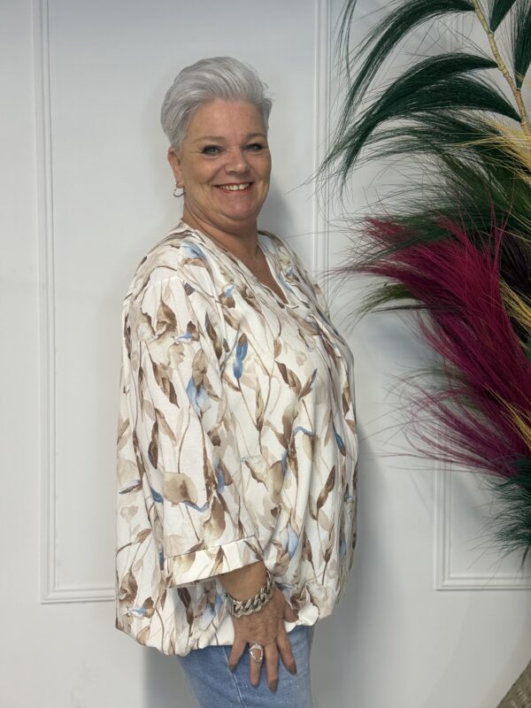Deze modieuze ballontop heeft een elegante en zachte blad- en natuurprint. De print bestaat uit sierlijke bladeren en takjes in aardetinten zoals beige en bruin, gecombineerd met subtiele lichtblauwe accenten. Dit geeft de top een rustige, vrouwelijke en tijdloze uitstraling die gemakkelijk te combineren is.