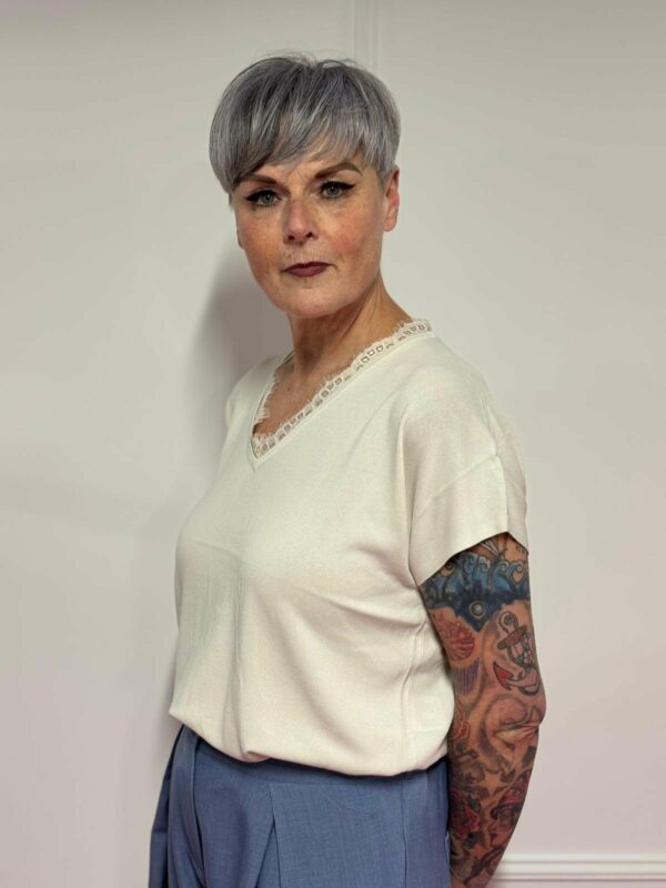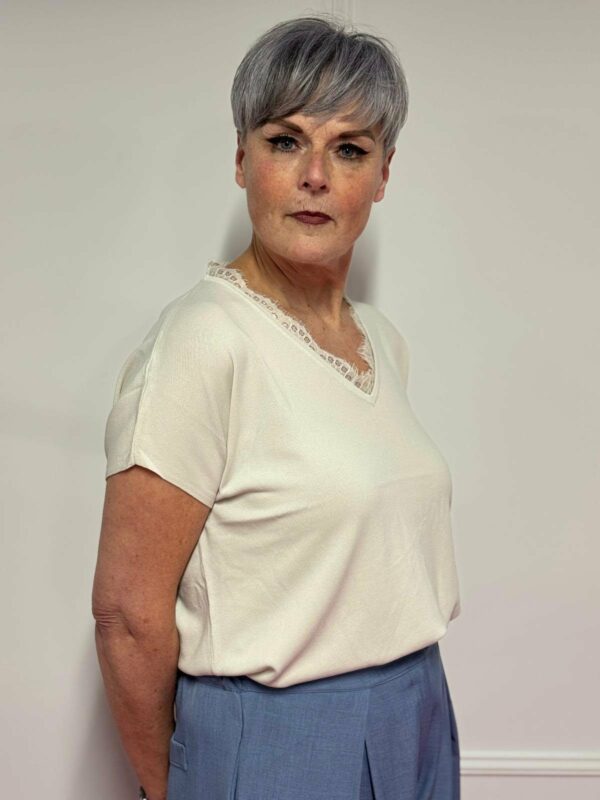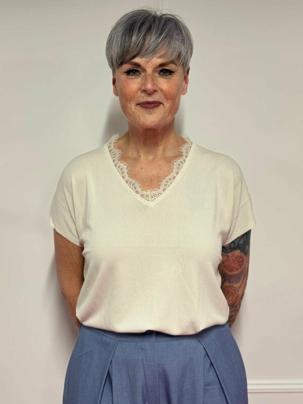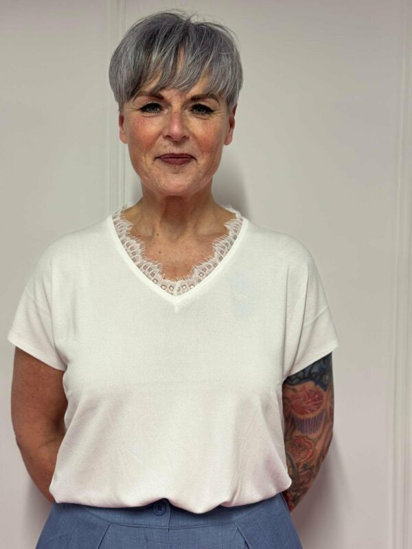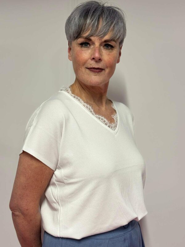Deze basic top met kant is een veelzijdige musthave voor je garderobe. Het kantdetail geeft een subtiel vrouwelijk accent, terwijl de zachte stof heerlijk comfortabel draagt en mooi valt. Perfect om casual te dragen of te combineren met een nette broek of rok voor een geklede look.