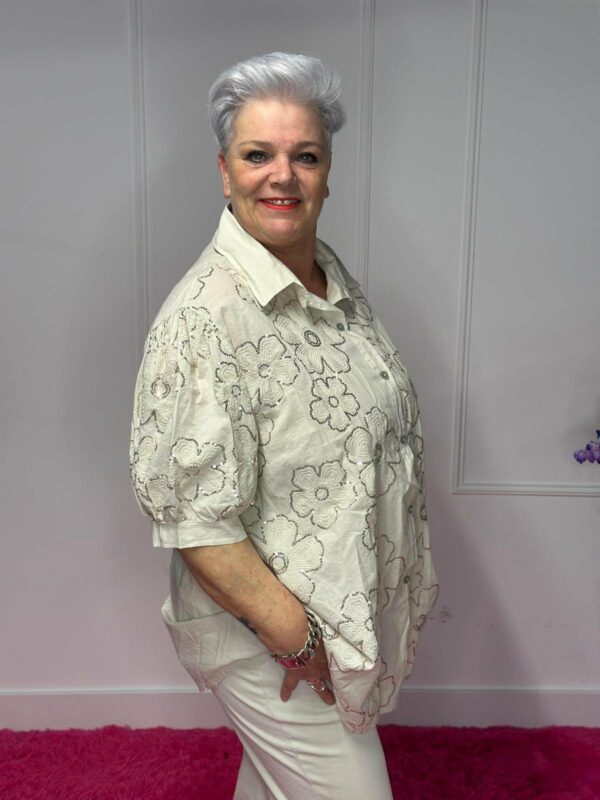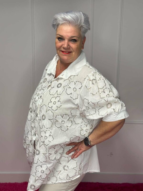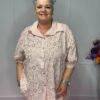 Gemaakt van 100% katoen, waardoor de blouse ademend en prettig draagt. Het one size model kan gedragen worden tot en met maat 50/52.