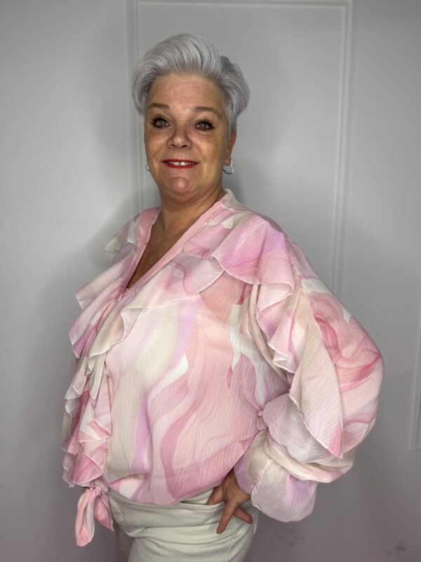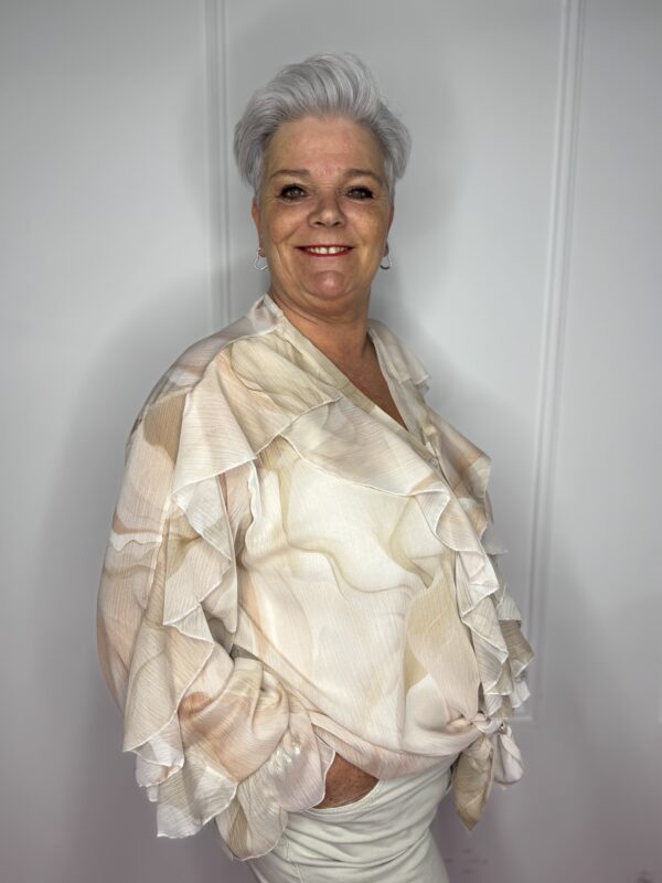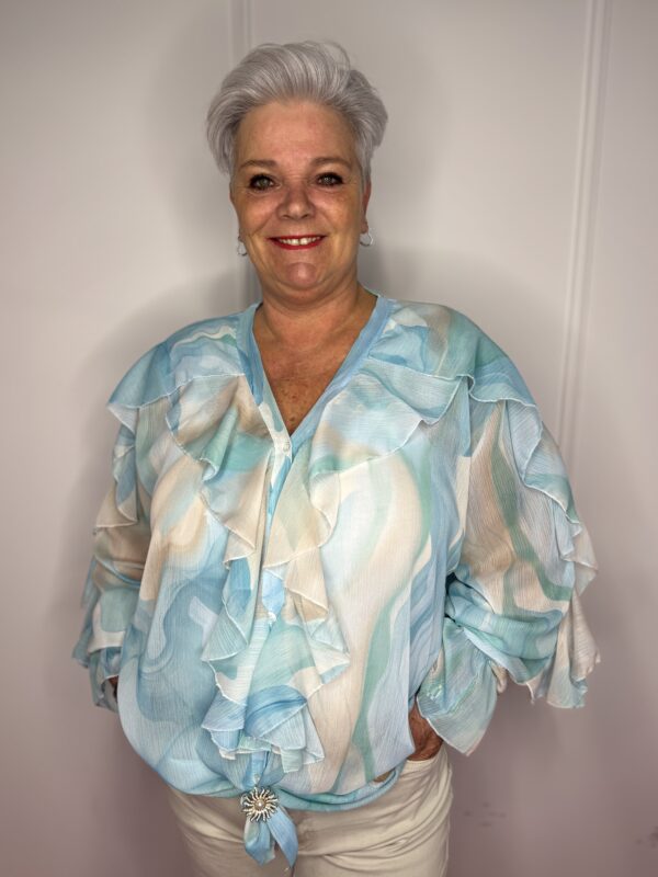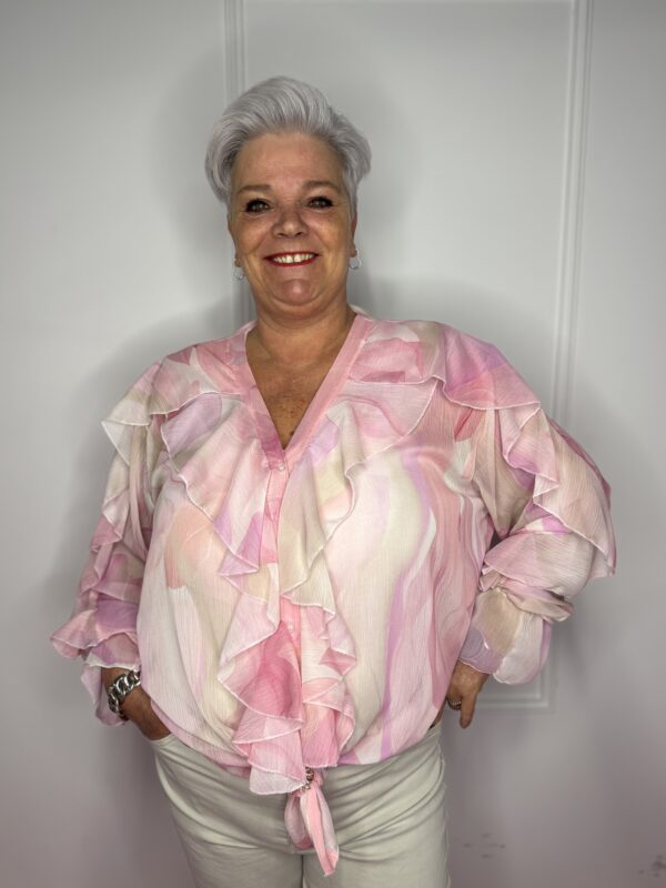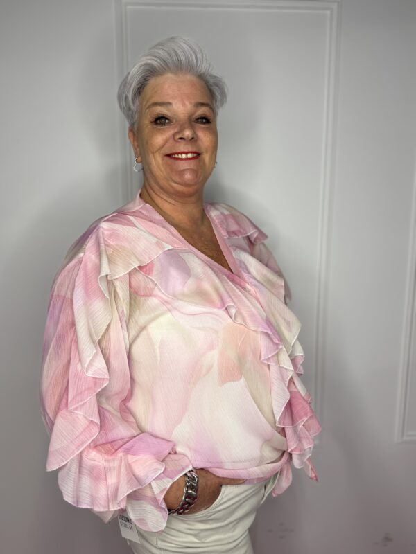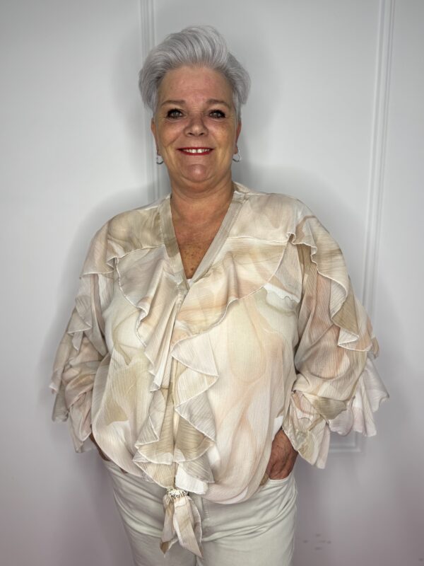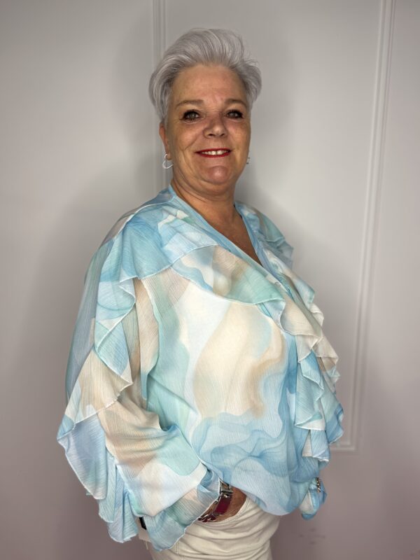 Deze stijlvolle blouse met speelse roezels en een mooie print is een echte eyecatcher 💖 Perfect om jouw outfit net dat beetje extra te geven!
