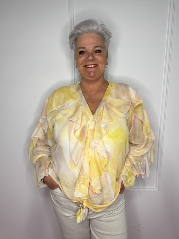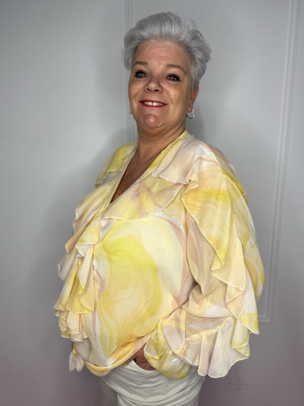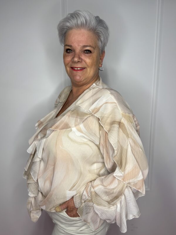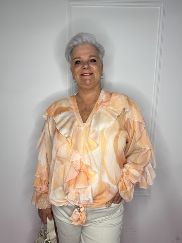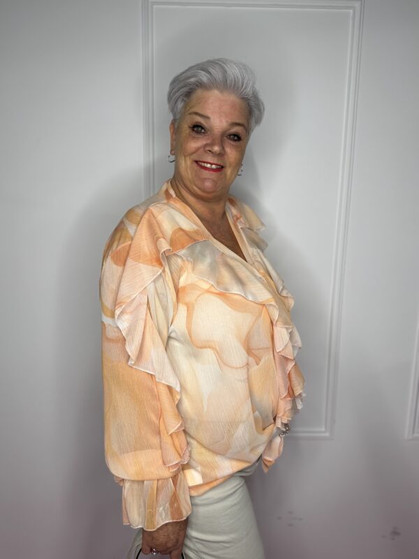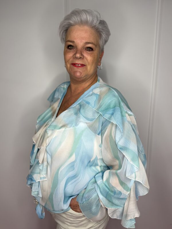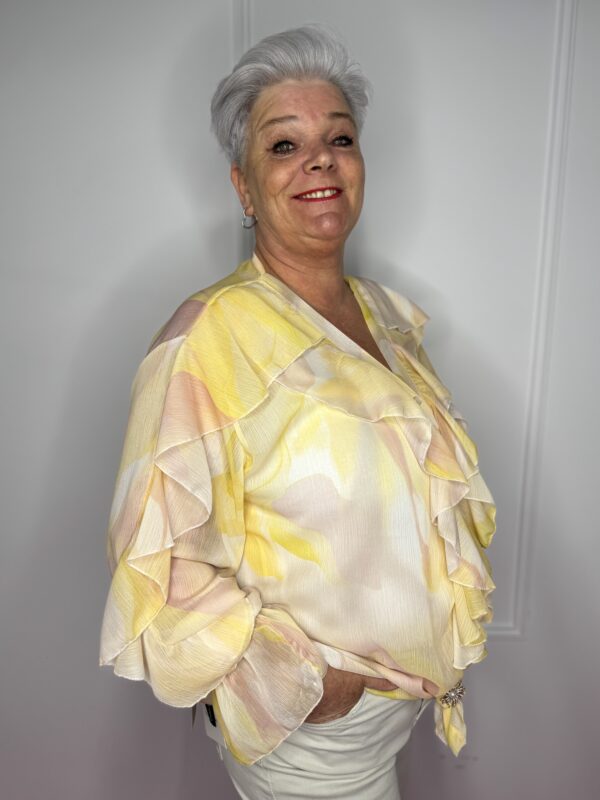 Deze stijlvolle blouse met speelse roezels en een mooie print is een echte eyecatcher 💖 Perfect om jouw outfit net dat beetje extra te geven!