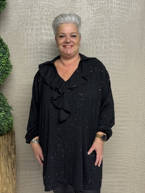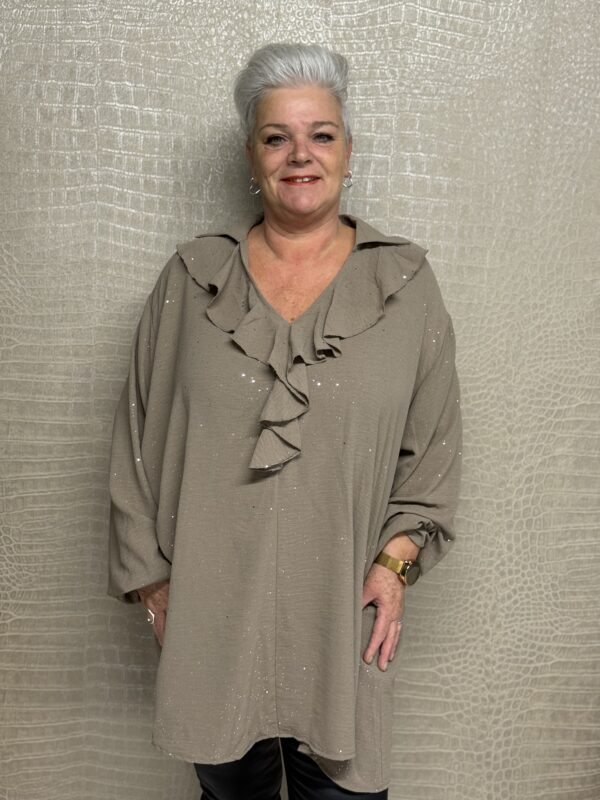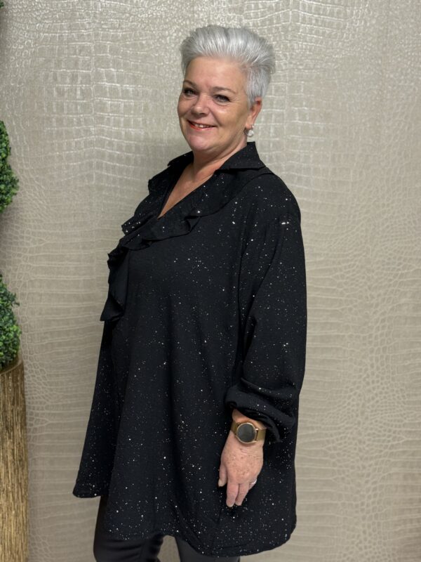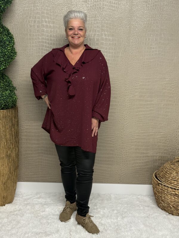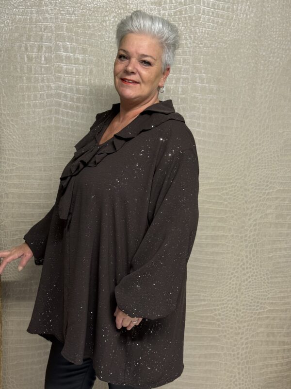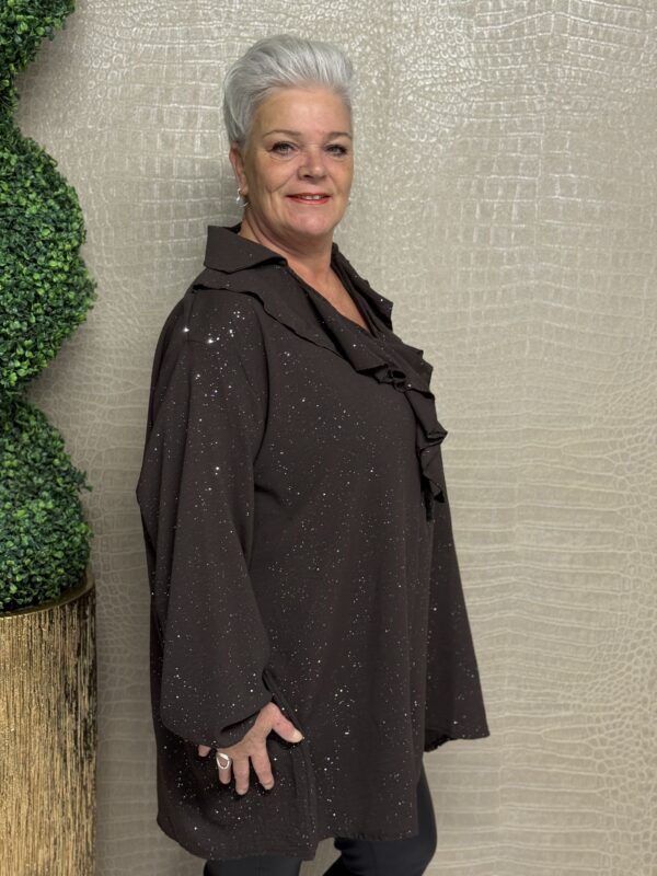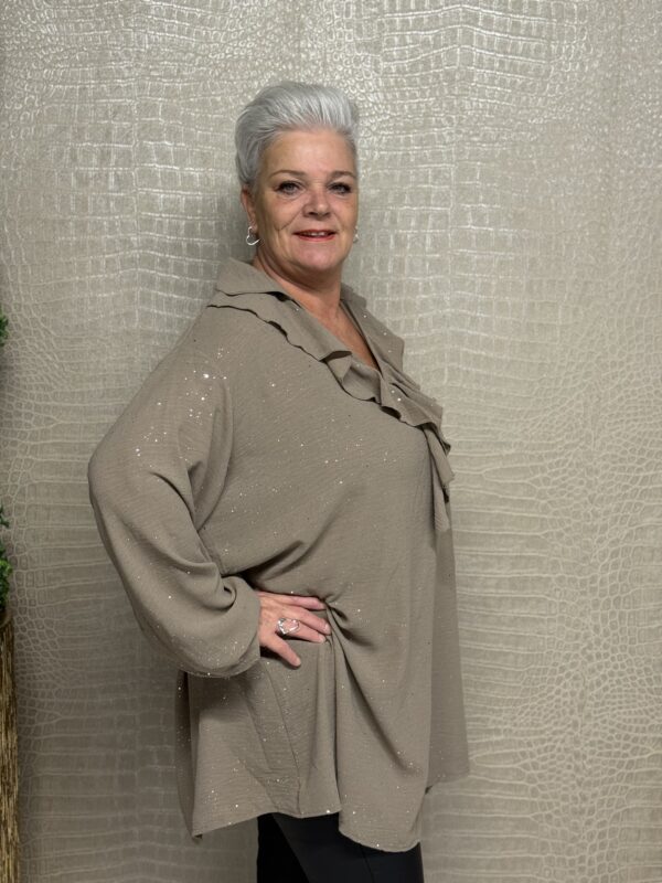 Voeg een vleugje glamour toe aan je outfit met onze Blouse Sparkling met roersel! Deze stijlvolle blouse heeft een subtiele glans en een speels roersel aan de voorkant, wat zorgt voor een flatterend en vrouwelijk effect. Dankzij de soepele stof en lichte stretch zit de blouse heerlijk comfortabel én oogt ze chic.