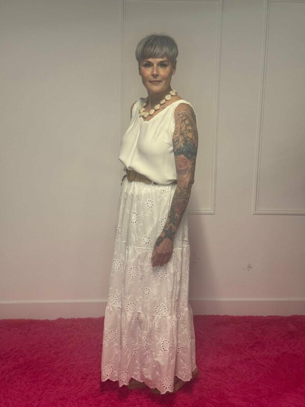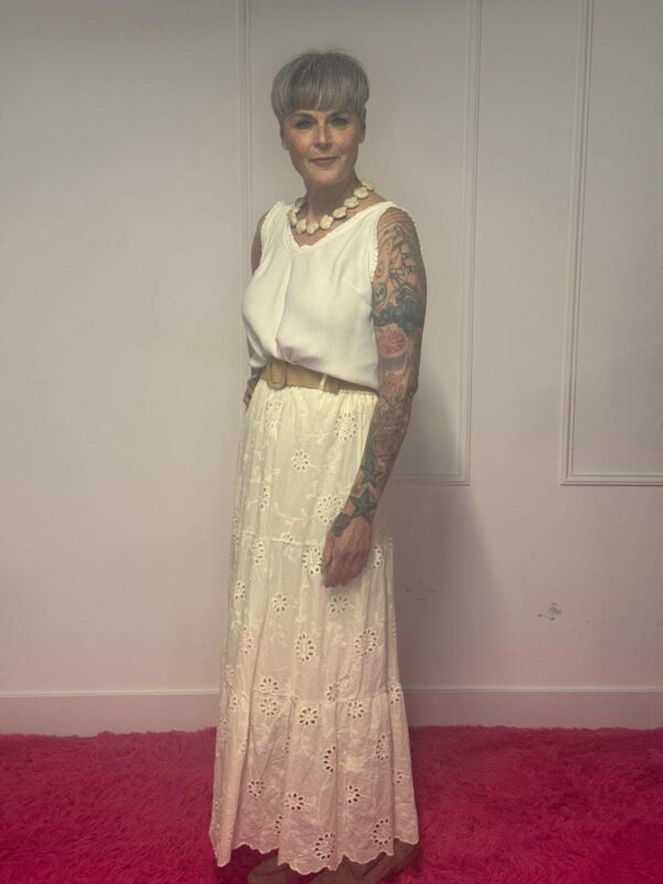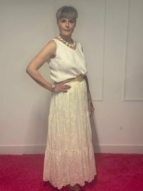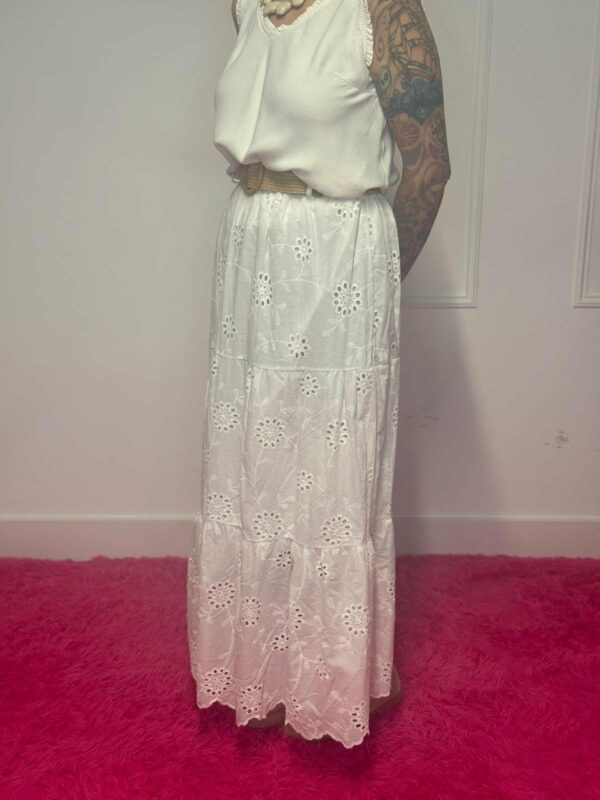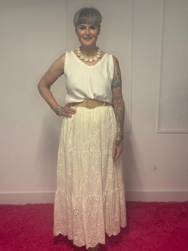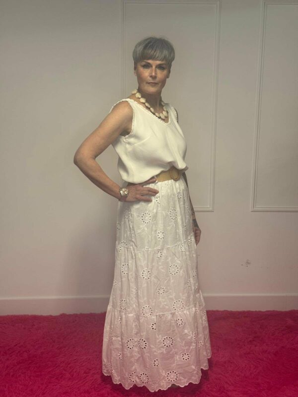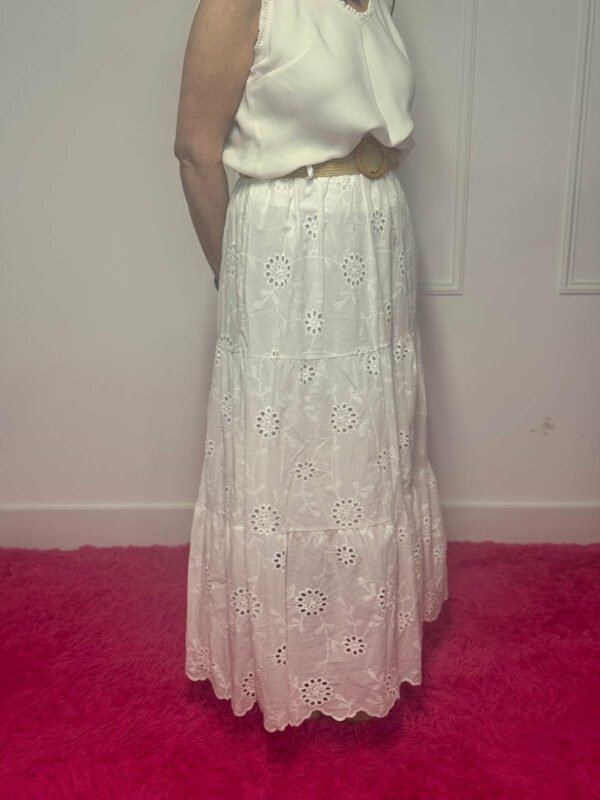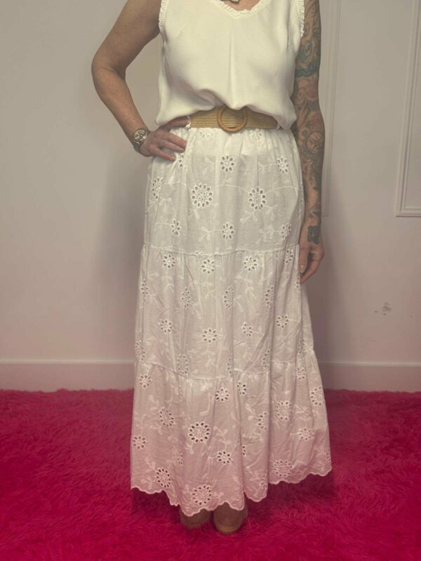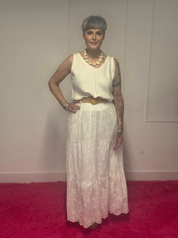 Deze broderie rok met riem is een perfecte combinatie van elegantie en comfort. De verfijnde broderie details geven de rok een romantische en vrouwelijke uitstraling, terwijl de bijpassende riem zorgt voor een mooie, geaccentueerde taille.