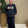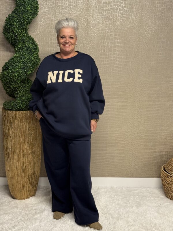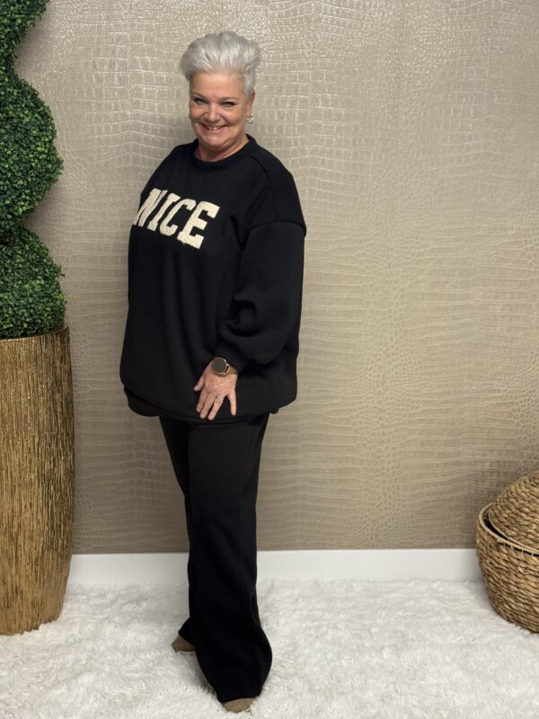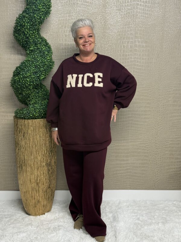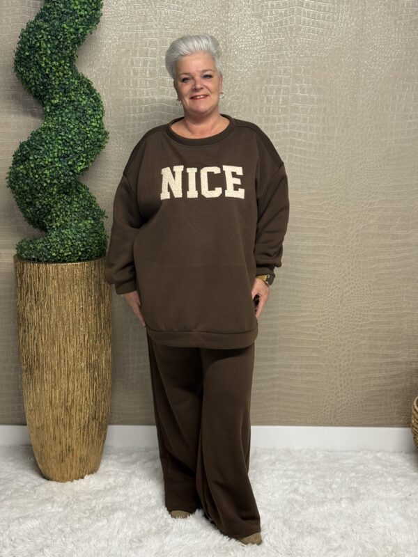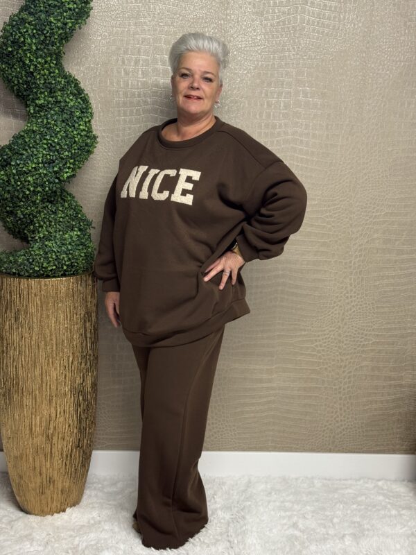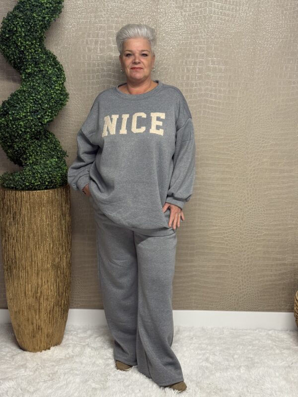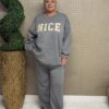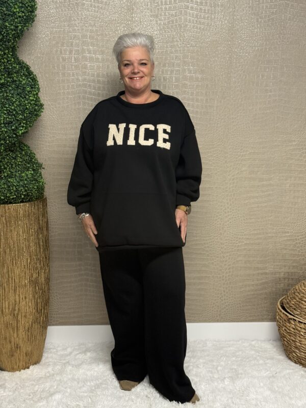 Ons Comfy Pak met tekst “Nice” is de ideale combinatie van comfort en stijl! Deze set is gemaakt van een zachte katoenmix met stretch, waardoor het heerlijk zit en toch mooi in model blijft. De subtiele “Nice” opdruk geeft de outfit een sportieve en trendy look. Perfect voor een relaxte dag thuis of een casual dagje uit.