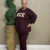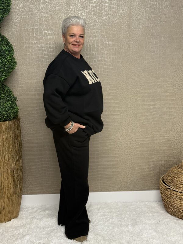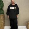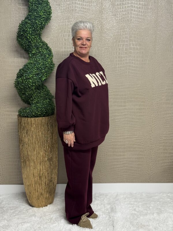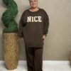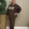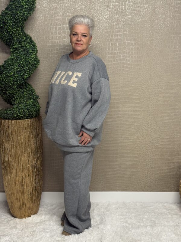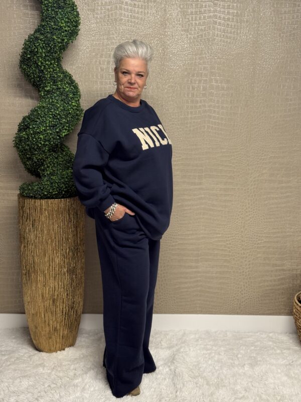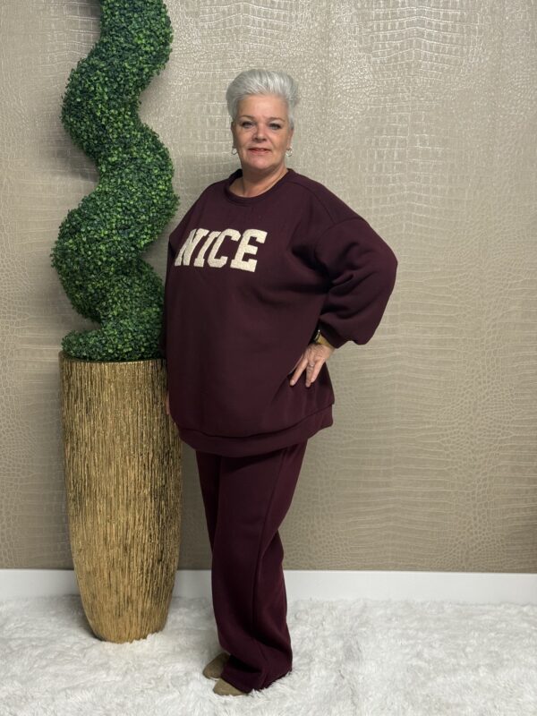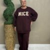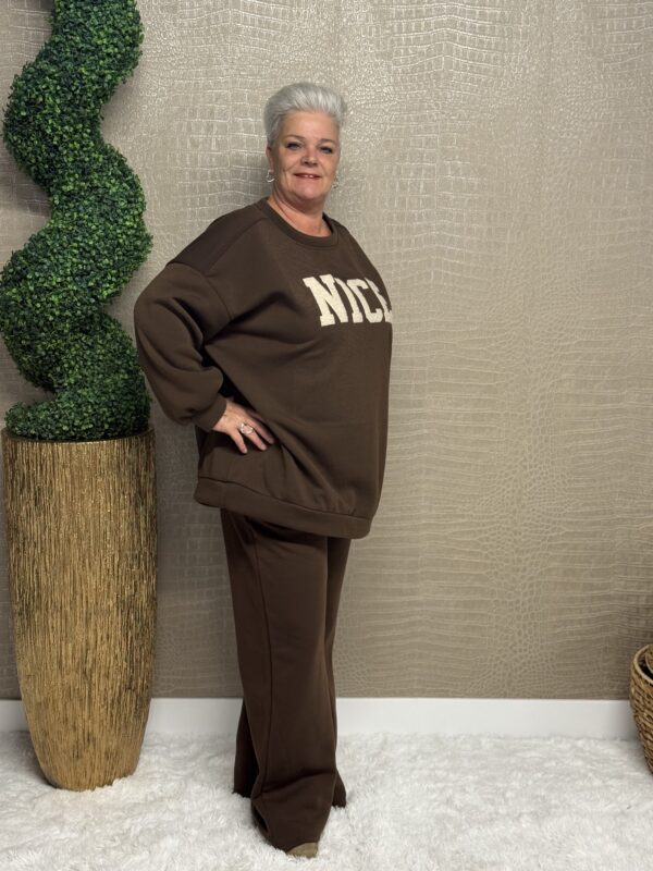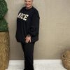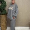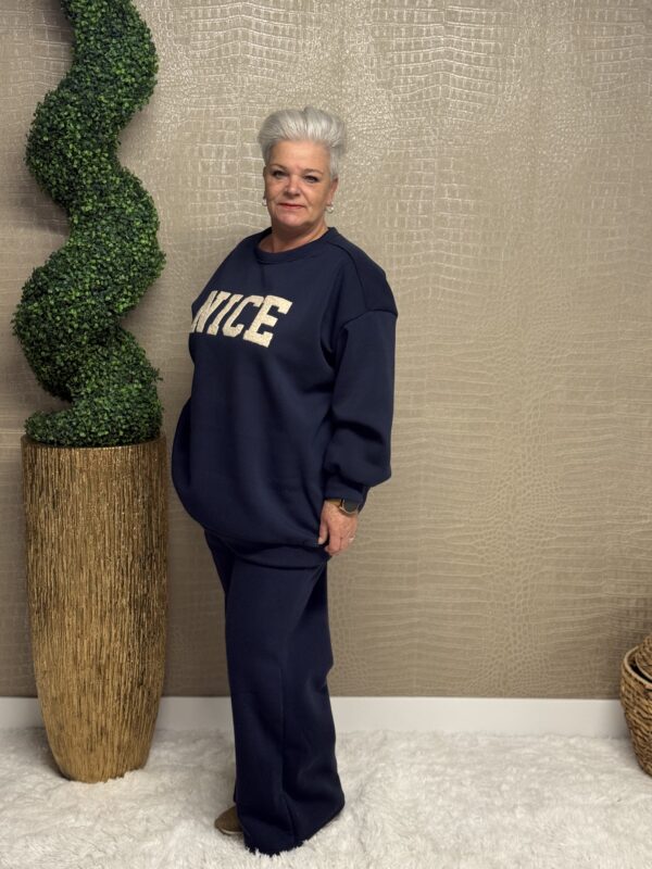 Ons Comfy Pak met tekst “Nice” is de ideale combinatie van comfort en stijl! Deze set is gemaakt van een zachte katoenmix met stretch, waardoor het heerlijk zit en toch mooi in model blijft. De subtiele “Nice” opdruk geeft de outfit een sportieve en trendy look. Perfect voor een relaxte dag thuis of een casual dagje uit.