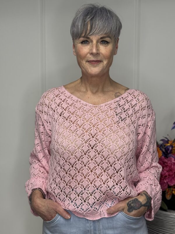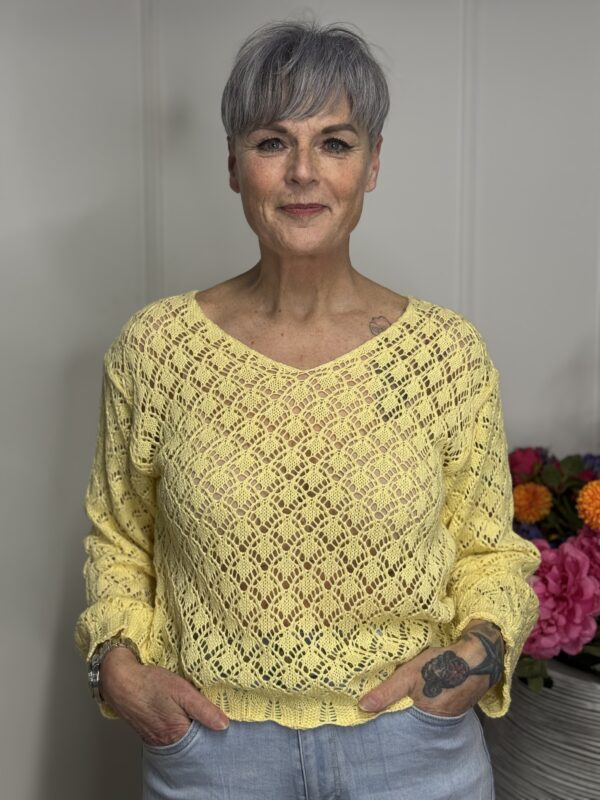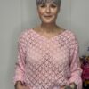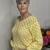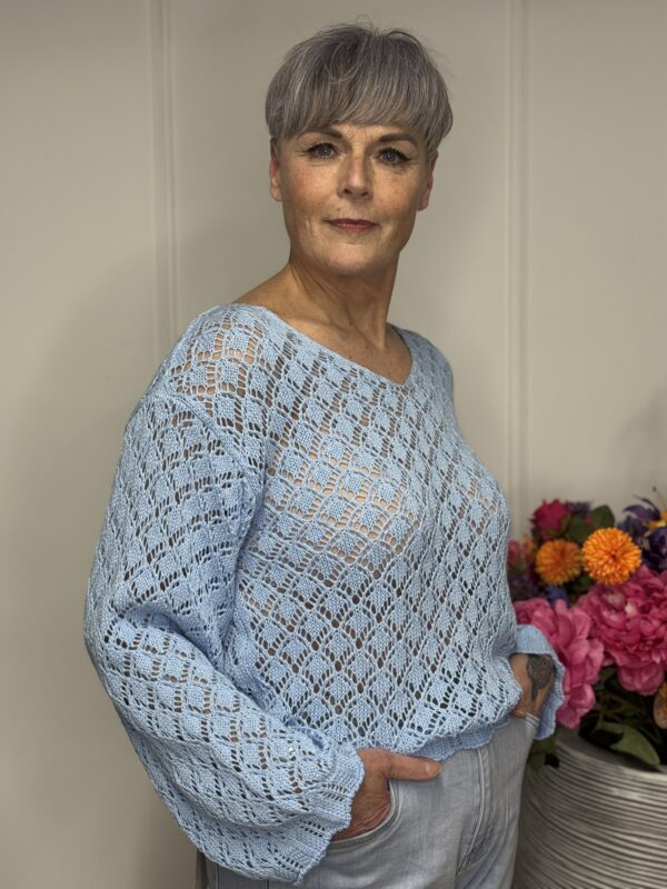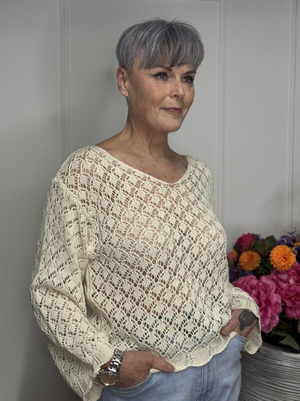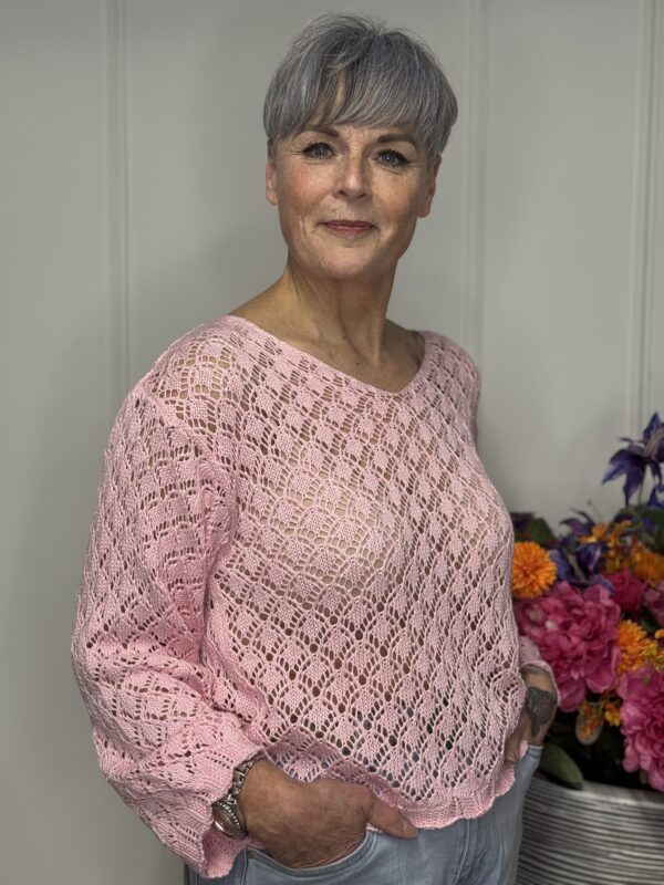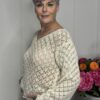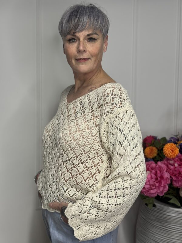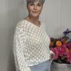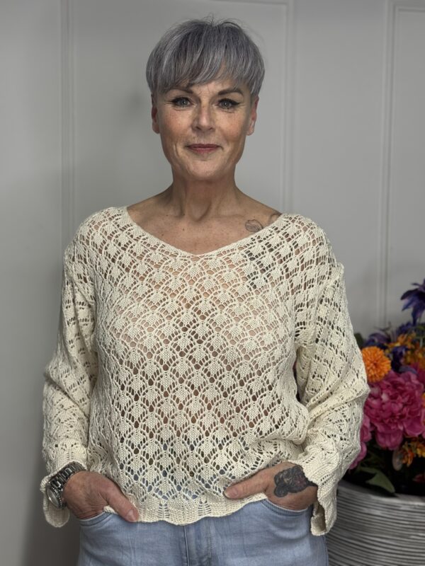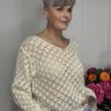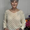 Deze gehaakte trui met V-hals is een stijlvolle en veelzijdige toevoeging aan je garderobe. Het opengewerkte haakpatroon geeft de trui een speelse, vrouwelijke uitstraling, terwijl de V-hals zorgt voor een flatterende belijning. De lange mouwen maken dit model perfect voor elk seizoen – draag ‘m zo of combineer met een top eronder.