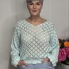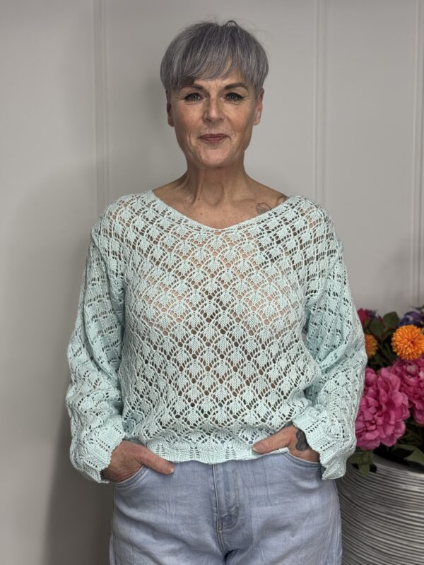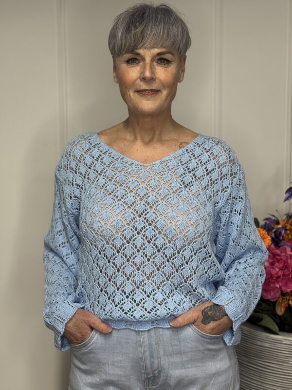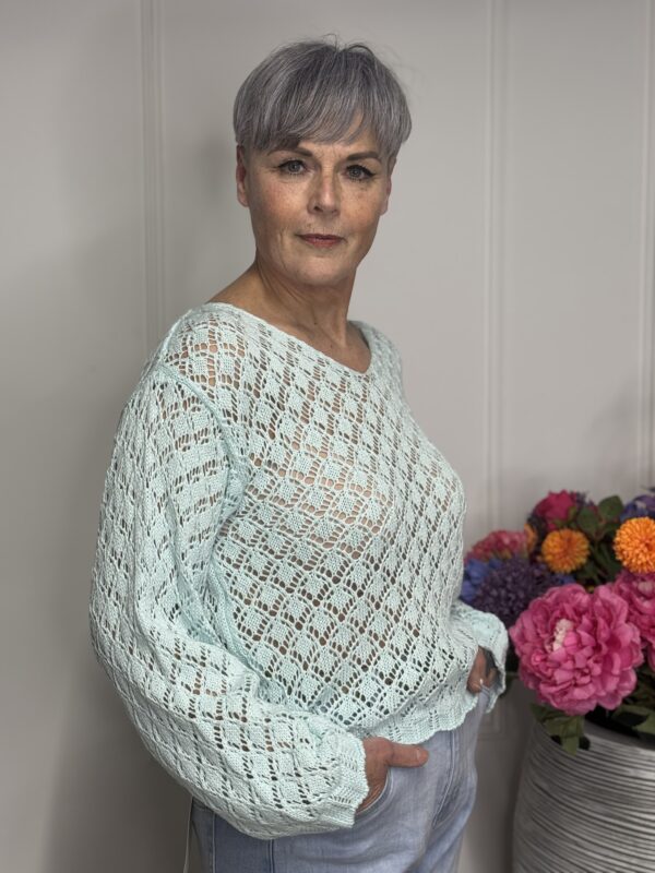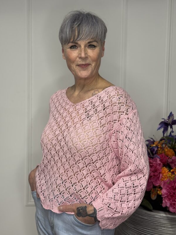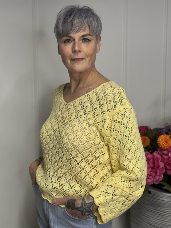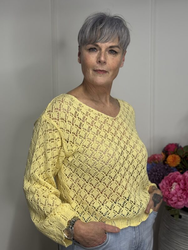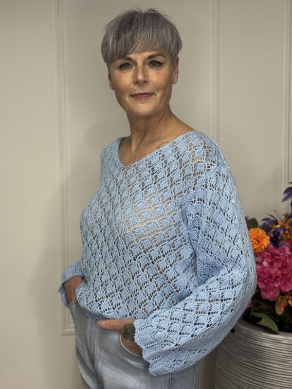 Deze gehaakte trui met V-hals is een stijlvolle en veelzijdige toevoeging aan je garderobe. Het opengewerkte haakpatroon geeft de trui een speelse, vrouwelijke uitstraling, terwijl de V-hals zorgt voor een flatterende belijning. De lange mouwen maken dit model perfect voor elk seizoen – draag ‘m zo of combineer met een top eronder.