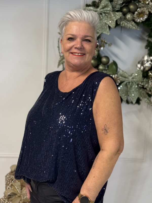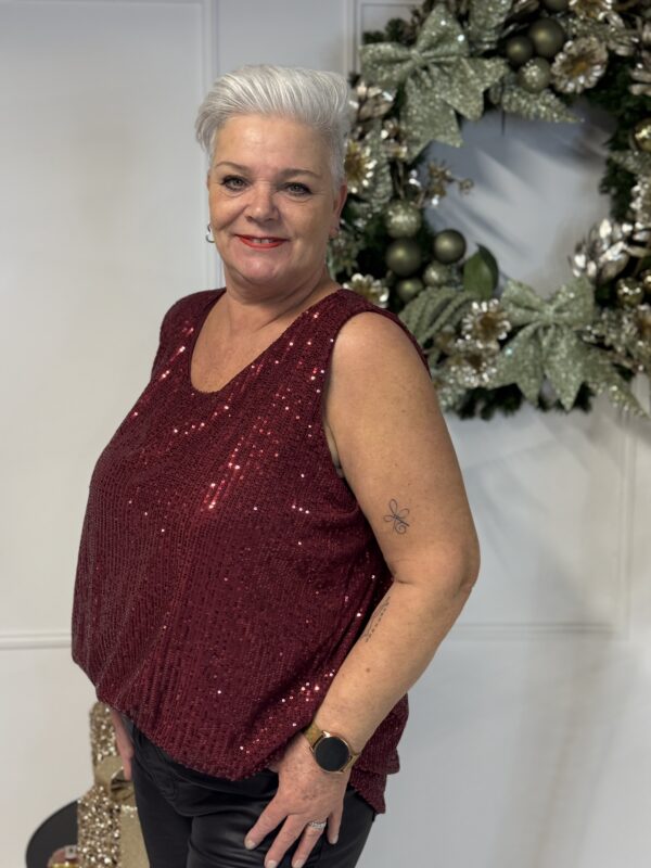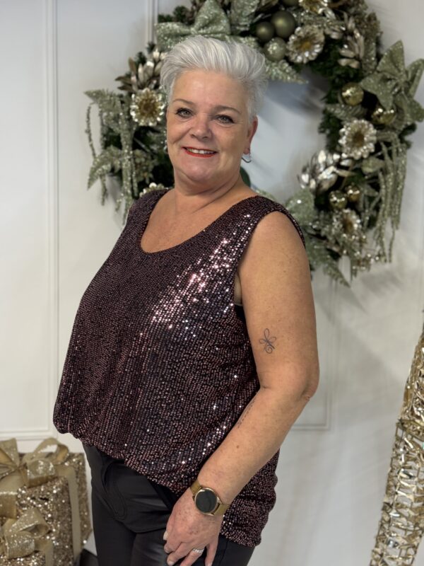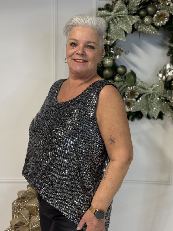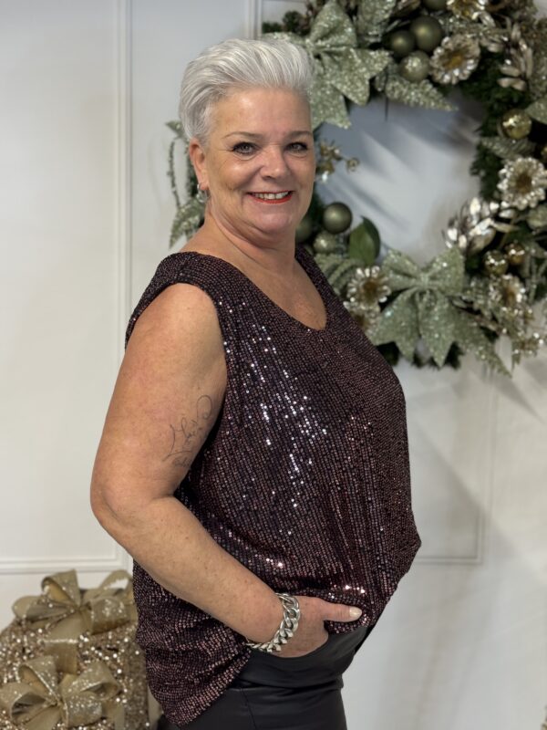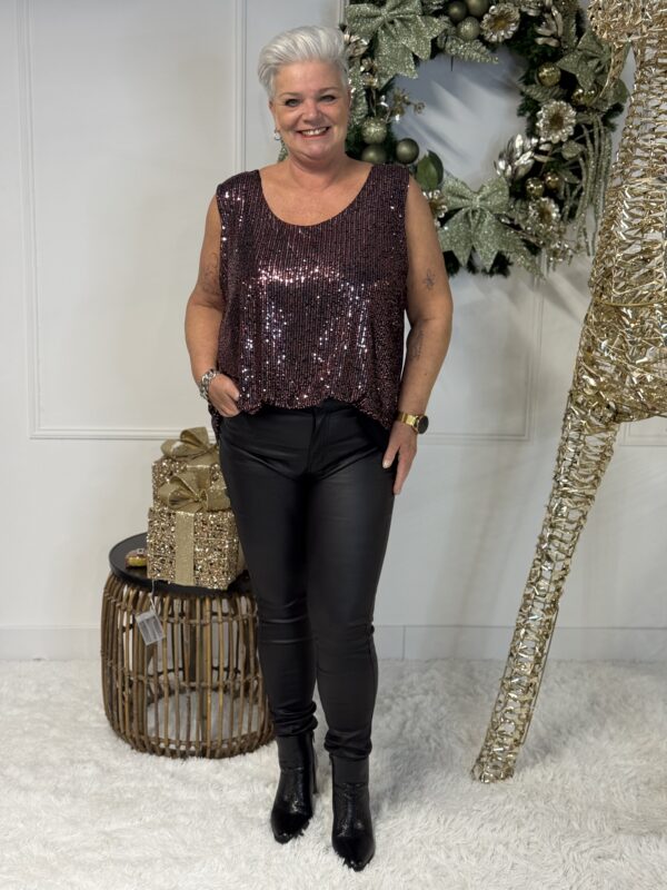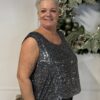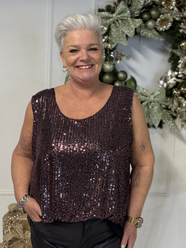 Voeg instant glamour toe aan je outfit met onze schitterende mouwloze pailletten top. Dankzij de volledig gevoerde binnenkant zit de top comfortabel, terwijl de sprankelende pailletten zorgen voor een luxe, feestelijke look. Perfect voor feestdagen, uitgaan of elke gelegenheid die een beetje extra sparkle verdient. Verkrijgbaar in meerdere prachtige kleuren.
