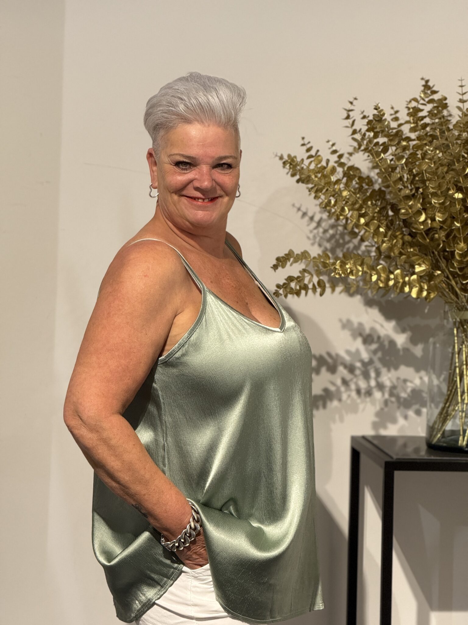 Met een oto-maat van 64 cm en een lengte van 79 cm past dit hemdje comfortabel tot en met maat 48/50. Verkrijgbaar in twee chique kleuren: offwhite en goud ā ideaal om te combineren met zowel casual als feestelijke outfits.