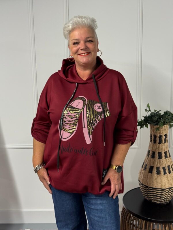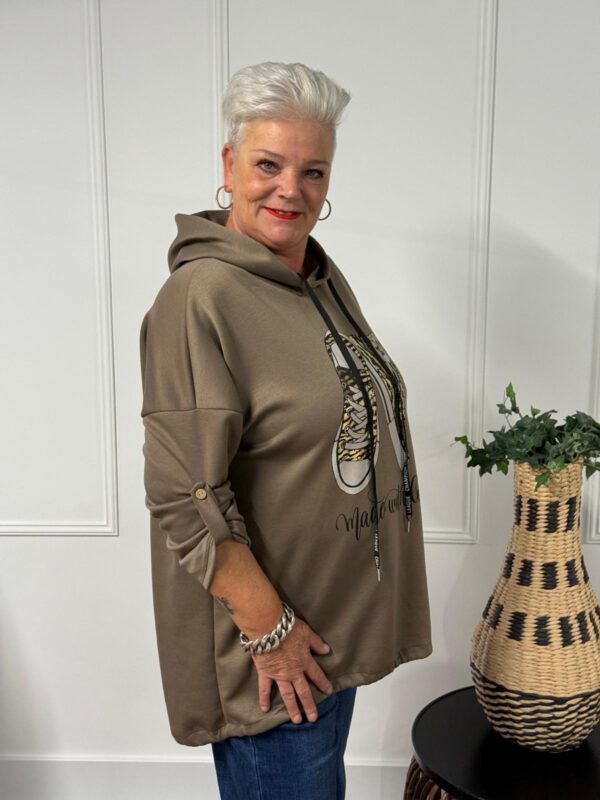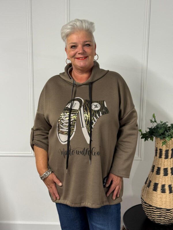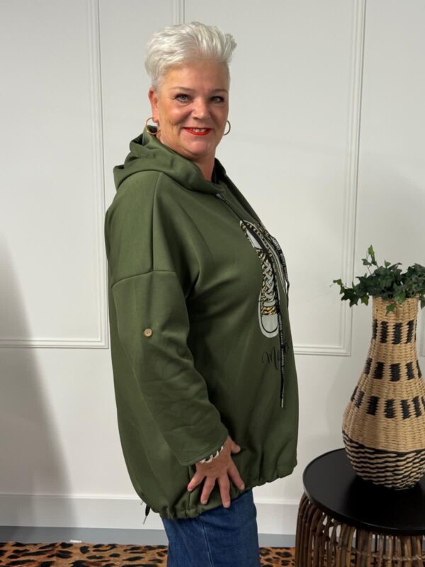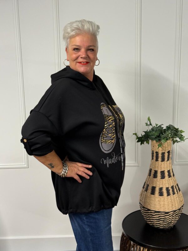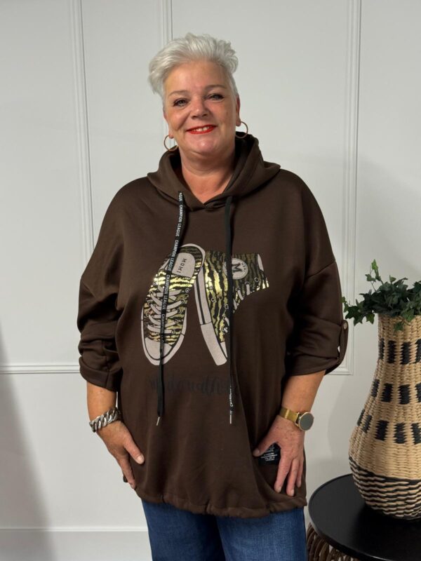 Deze hoodie is een echte eyecatcher! De opvallende sneaker afbeelding aan de voorkant geeft een stoere, modieuze look, terwijl het aanrijgkoordje aan de achterkant zorgt voor een speels detail én een mooie pasvorm. Dankzij het one size model, geschikt tot en met maat 46/48, zit deze hoodie heerlijk comfortabel.