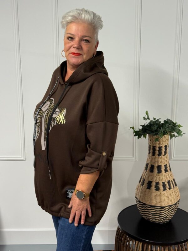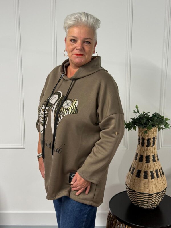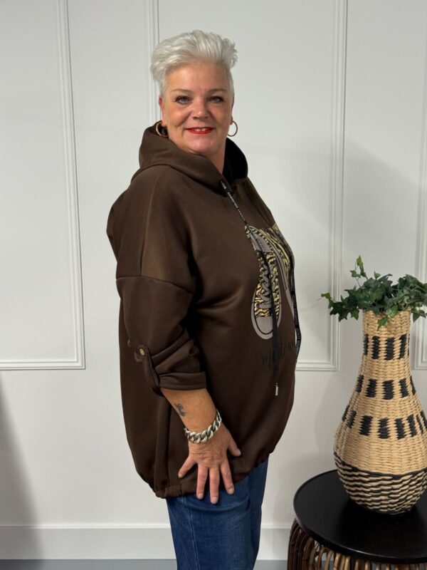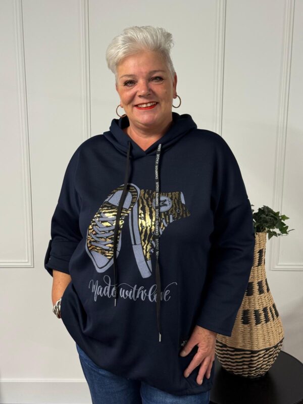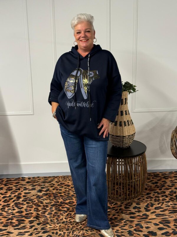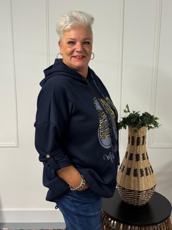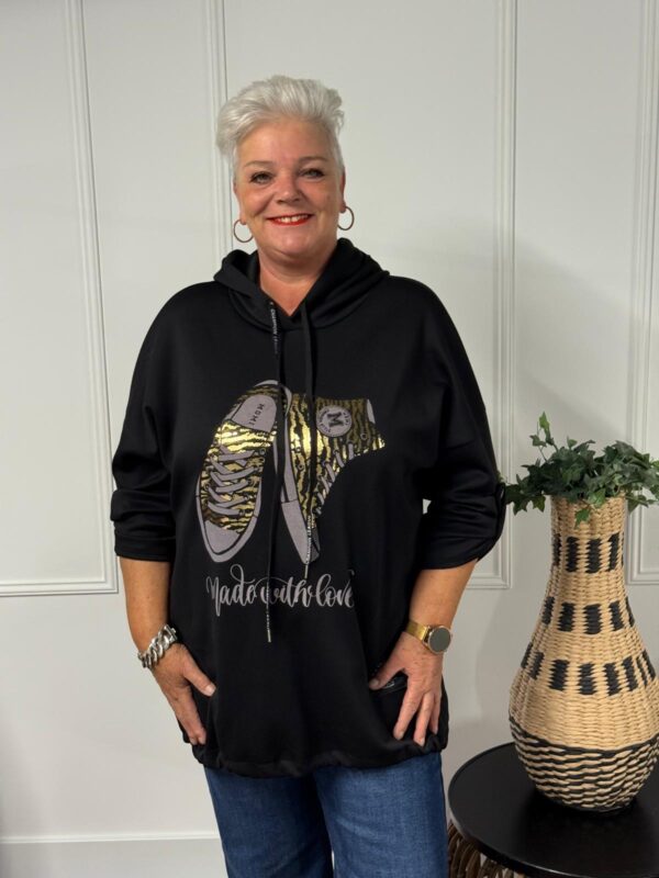 Deze hoodie is een echte eyecatcher! De opvallende sneaker afbeelding aan de voorkant geeft een stoere, modieuze look, terwijl het aanrijgkoordje aan de achterkant zorgt voor een speels detail én een mooie pasvorm. Dankzij het one size model, geschikt tot en met maat 46/48, zit deze hoodie heerlijk comfortabel.