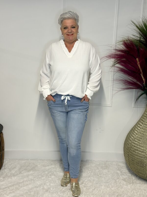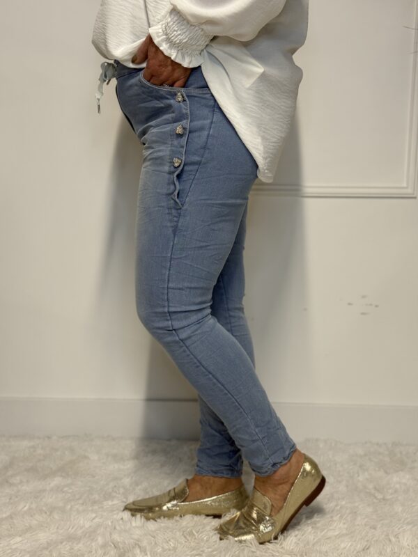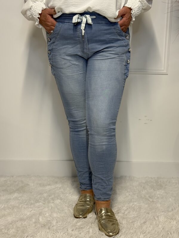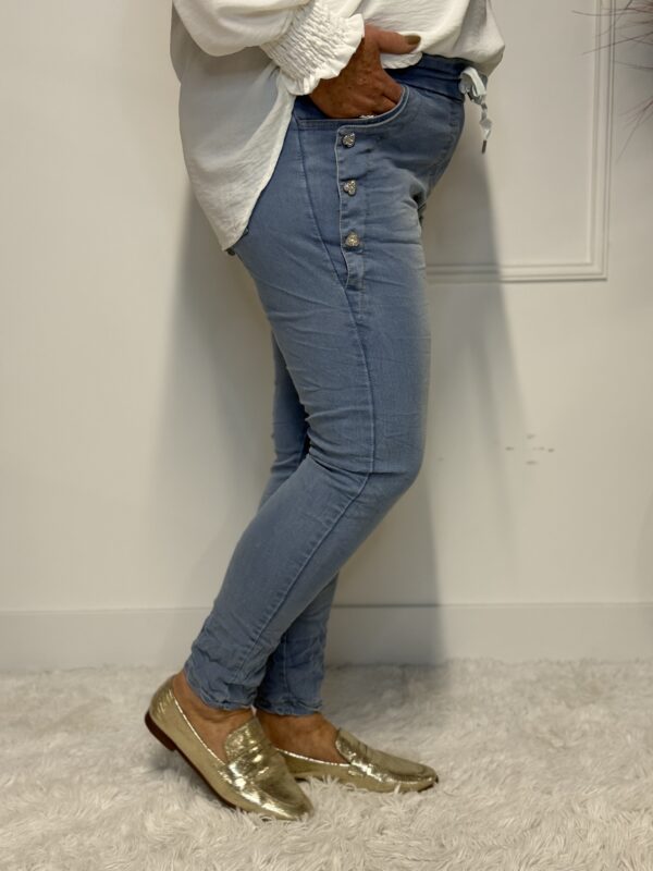 Deze jog jeans combineert het comfort van een joggingbroek met de look van een jeans! De decoratieve knopen geven de broek een stijlvolle touch, terwijl de zachte, stretchstof zorgt voor een heerlijke pasvorm. Dankzij het one size model is deze broek draagbaar tot en met maat 40/42.