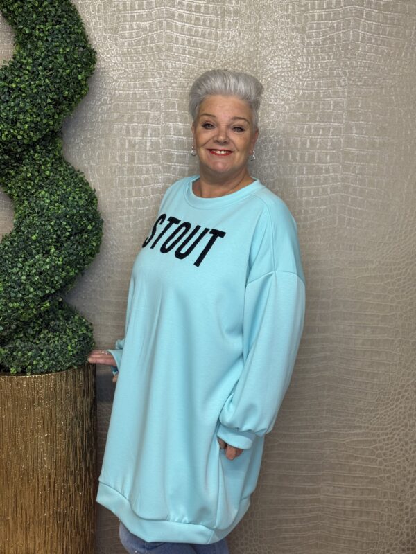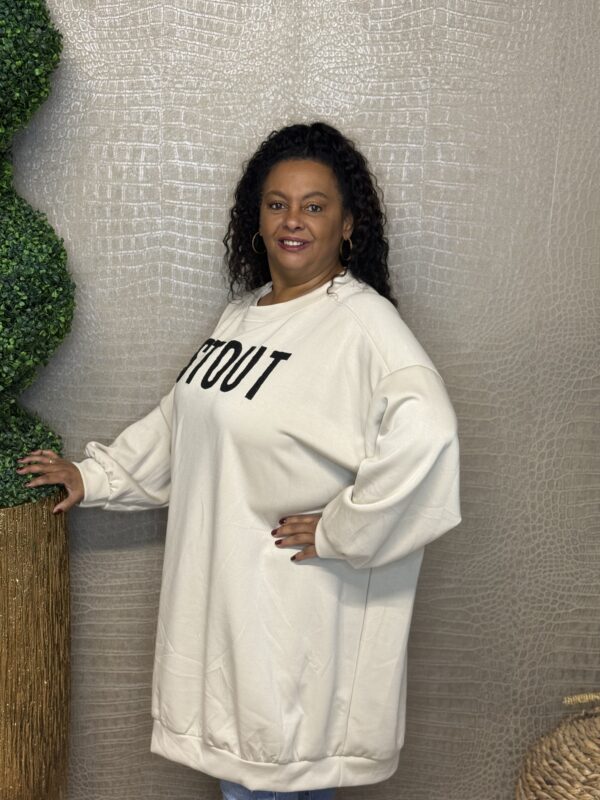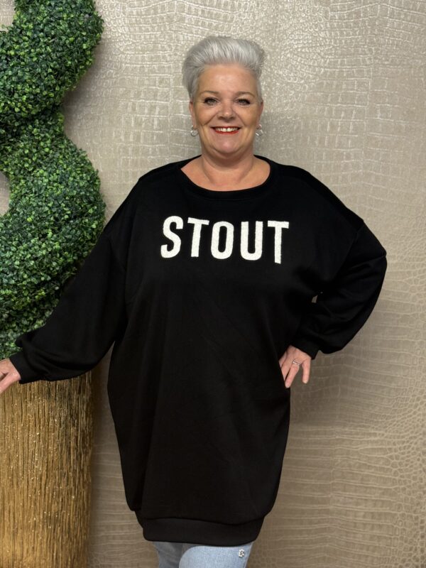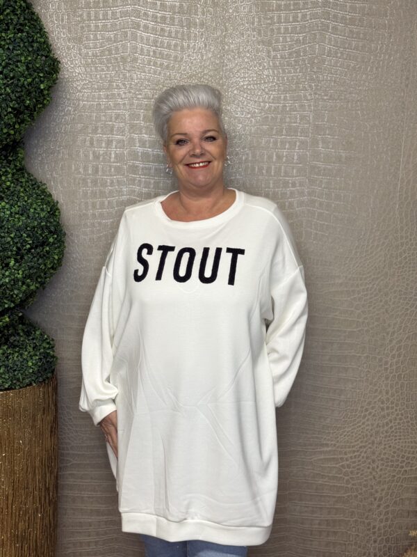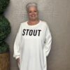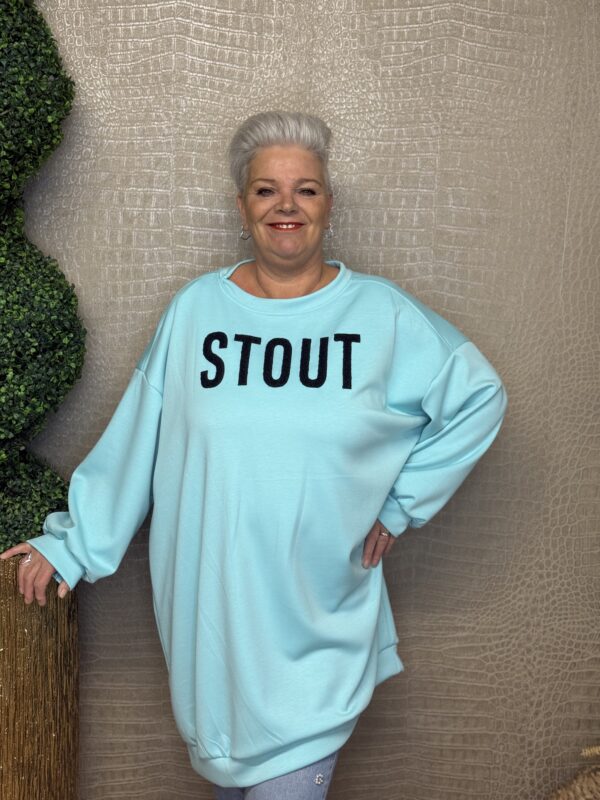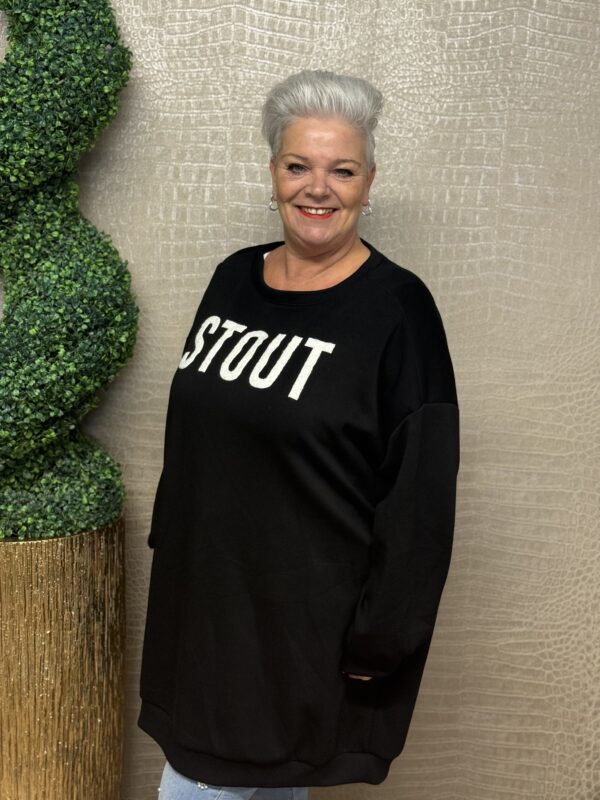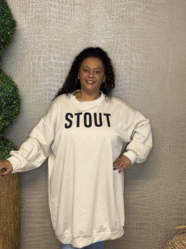 Deze comfortabele jog tuniek/trui is een perfecte combinatie van stijl en draaggemak. De tuniek is uitgevoerd in een zachte, soepele stof en heeft een casual uitstraling, ideaal voor dagelijks gebruik. Op de voorkant staat de tekst “Stout”, wat zorgt voor een speels en modieus detail.
