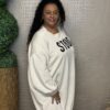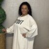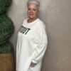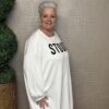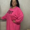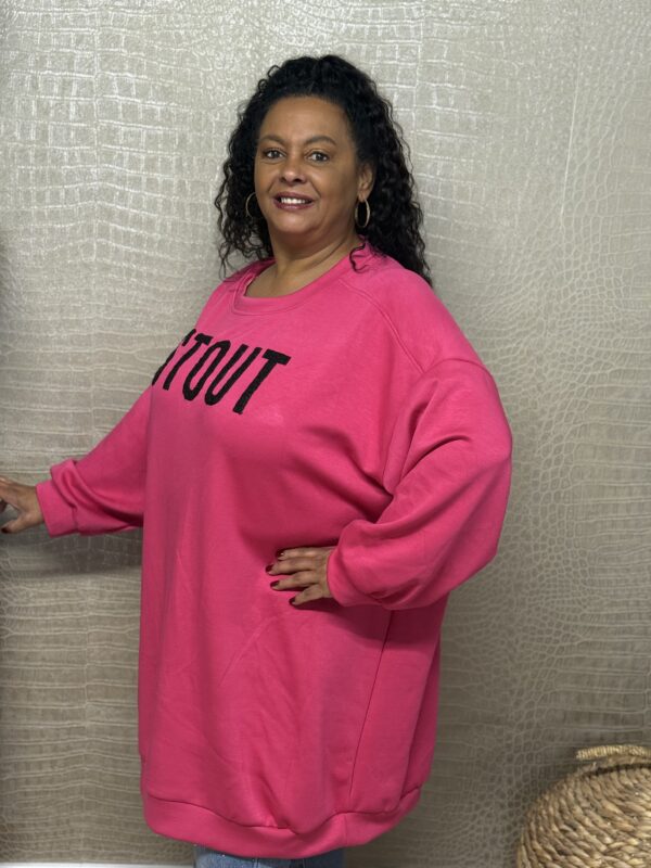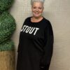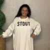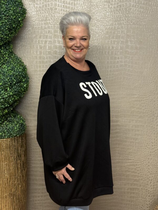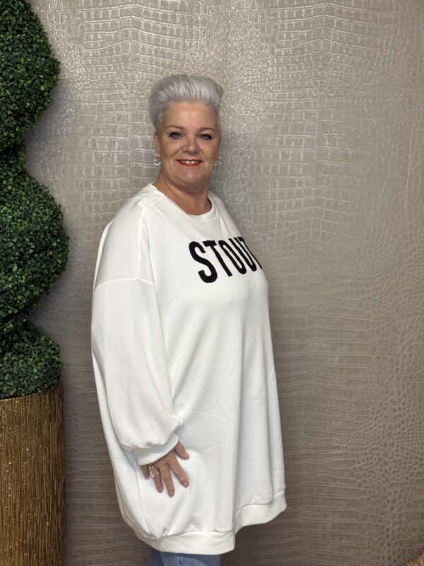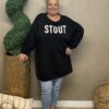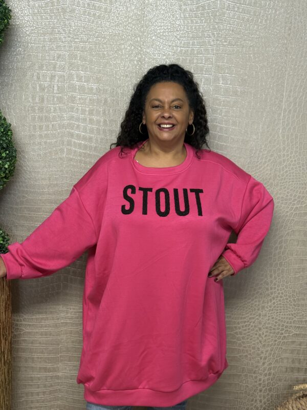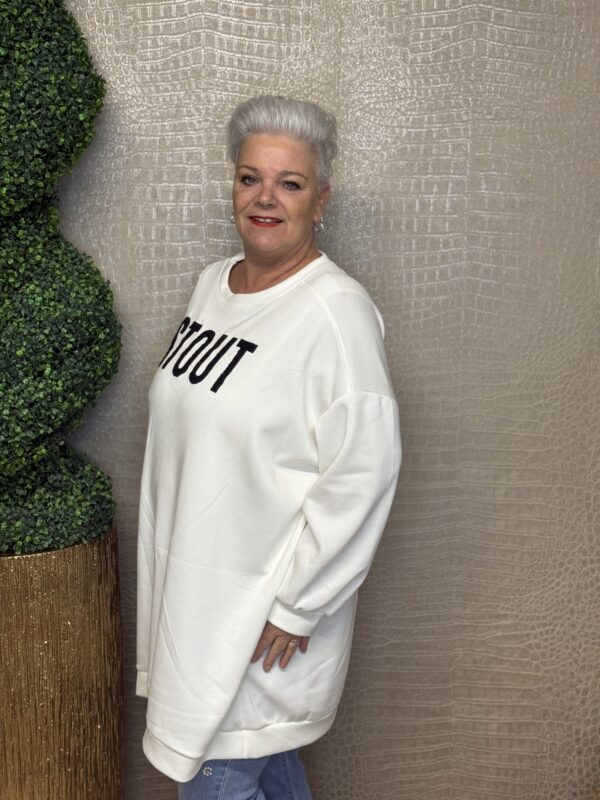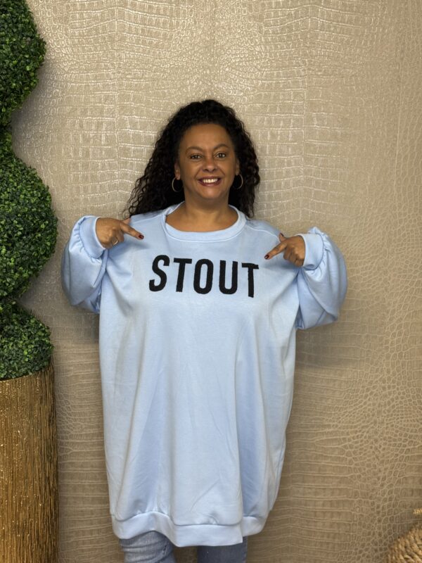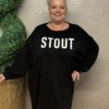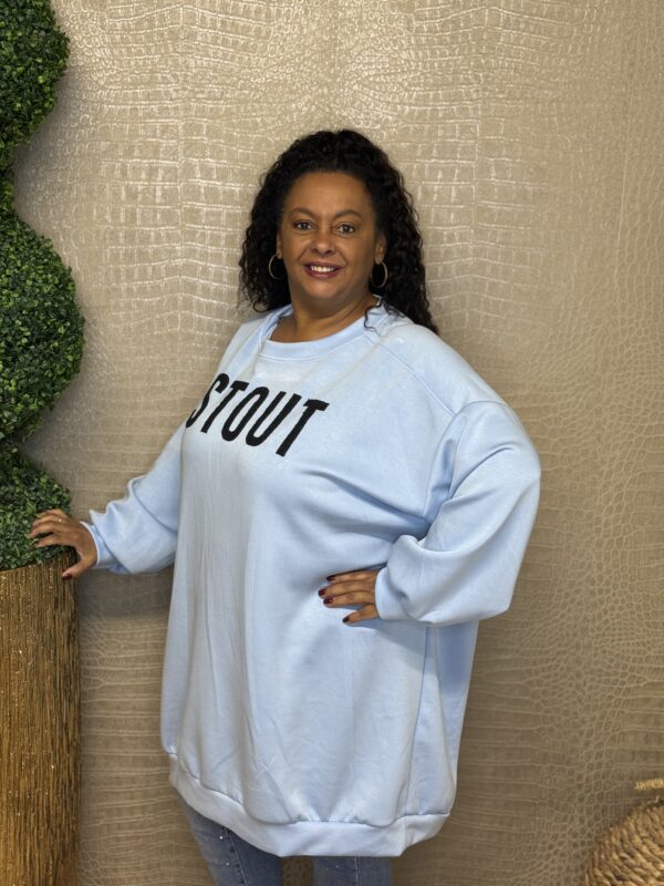 Deze comfortabele jog tuniek/trui is een perfecte combinatie van stijl en draaggemak. De tuniek is uitgevoerd in een zachte, soepele stof en heeft een casual uitstraling, ideaal voor dagelijks gebruik. Op de voorkant staat de tekst “Stout”, wat zorgt voor een speels en modieus detail.