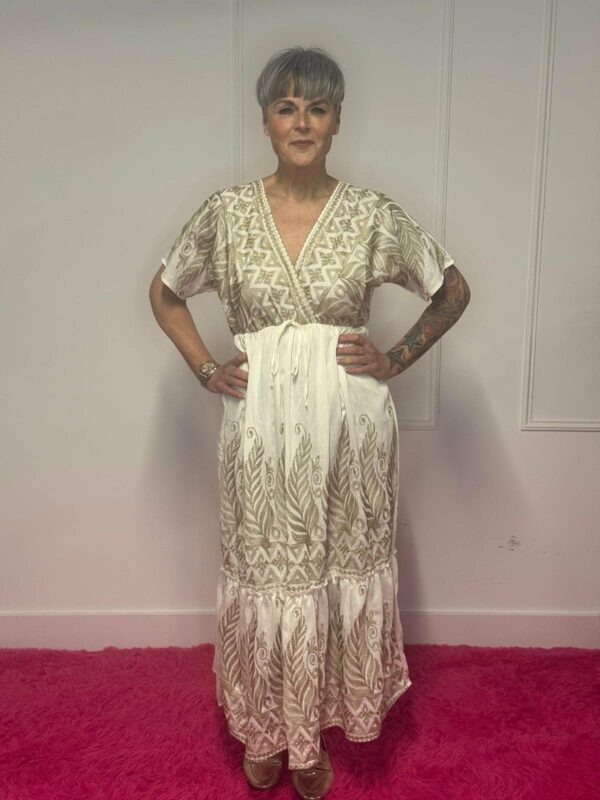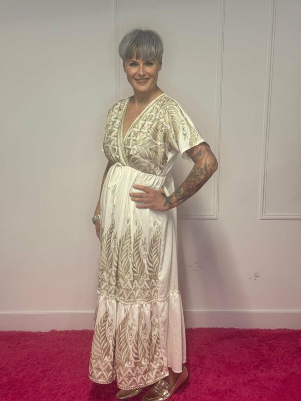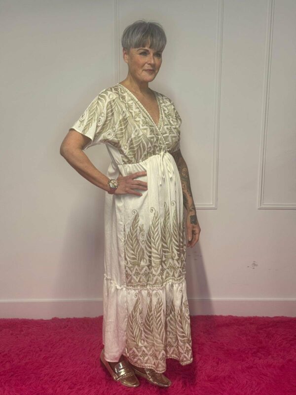 Deze jurk met gouden details straalt pure elegantie uit en is perfect voor zowel feestelijke gelegenheden als een stijlvolle dagelijkse look. De subtiele gouden accenten geven de jurk een luxe en verfijnde uitstraling.