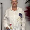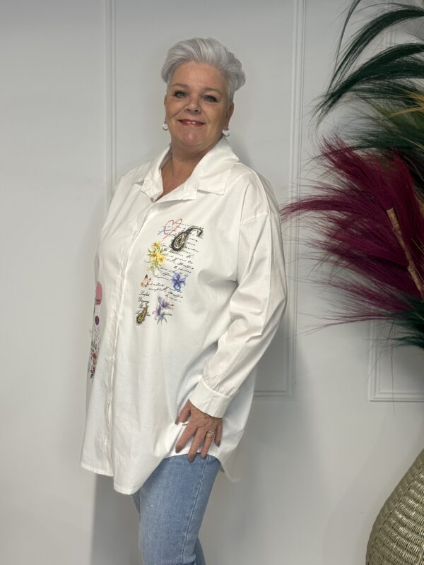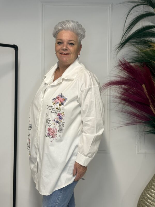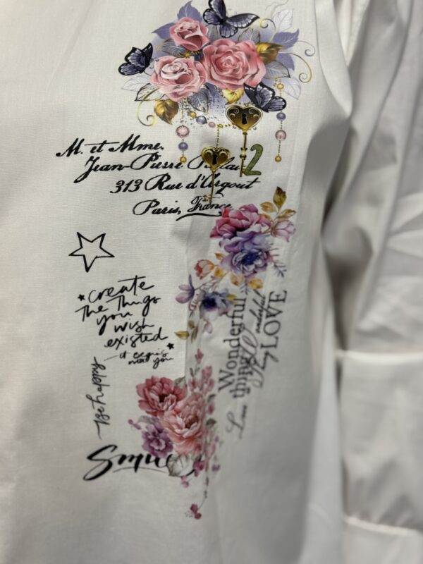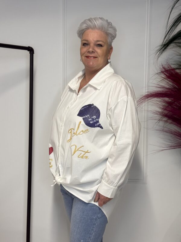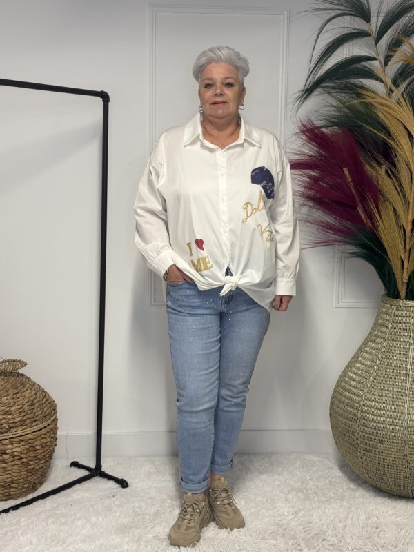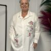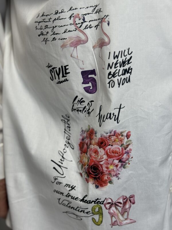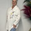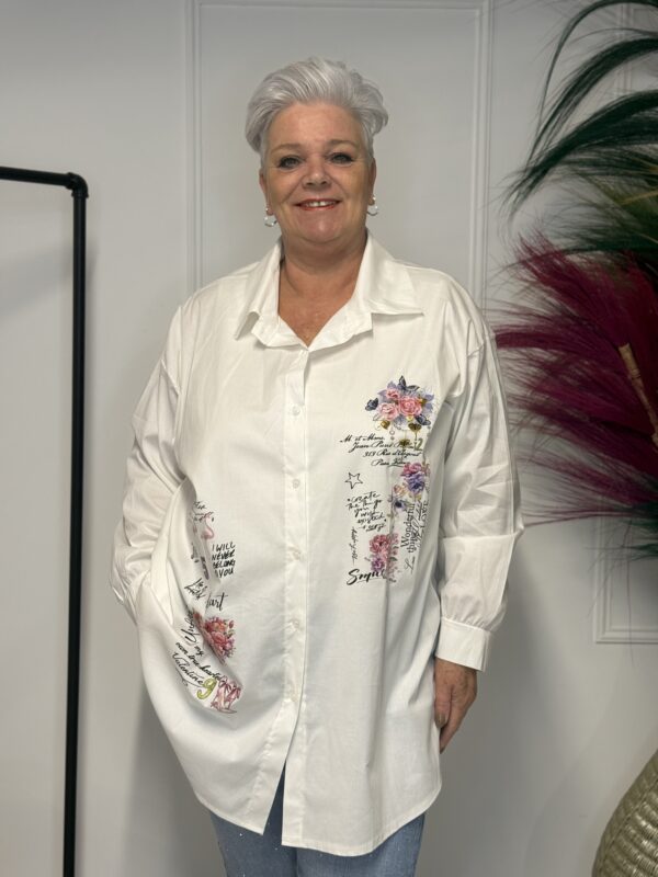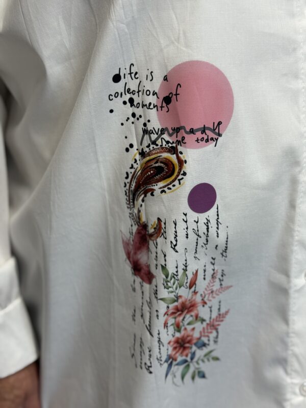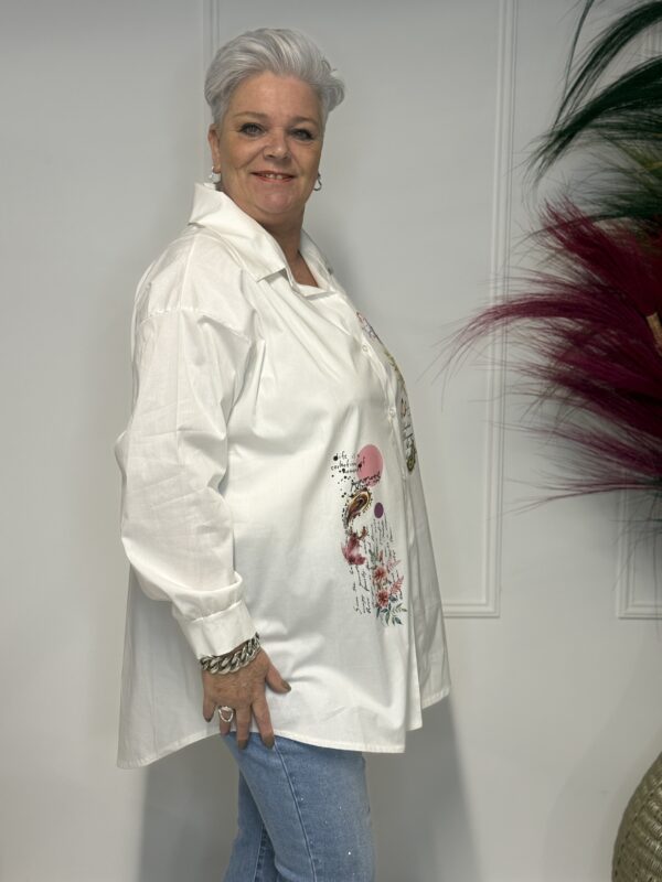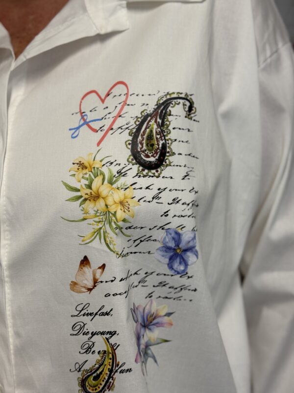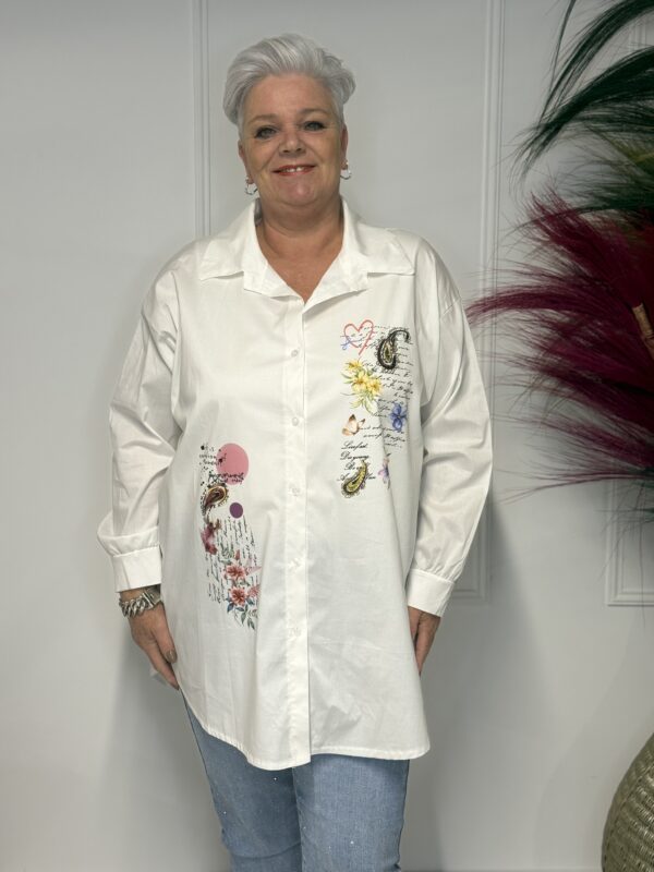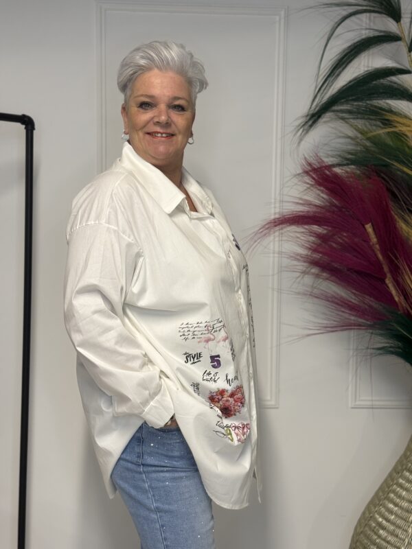 Deze comfortabele en stijlvolle katoenen blouse met opdruk is een veelzijdige toevoeging aan je garderobe. De blouse is verkrijgbaar in 3 verschillende modellen en heeft een one-size pasvorm, geschikt om te dragen tot en met maat 50/52.