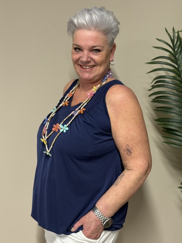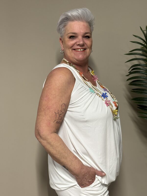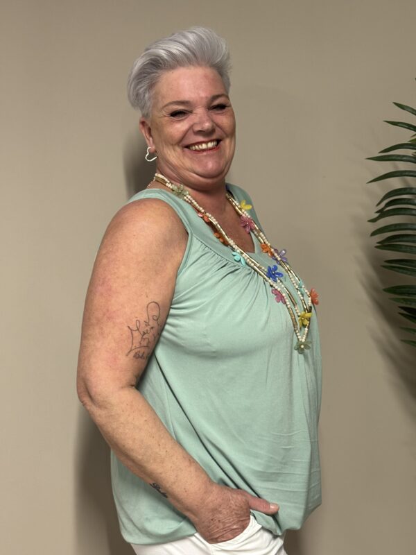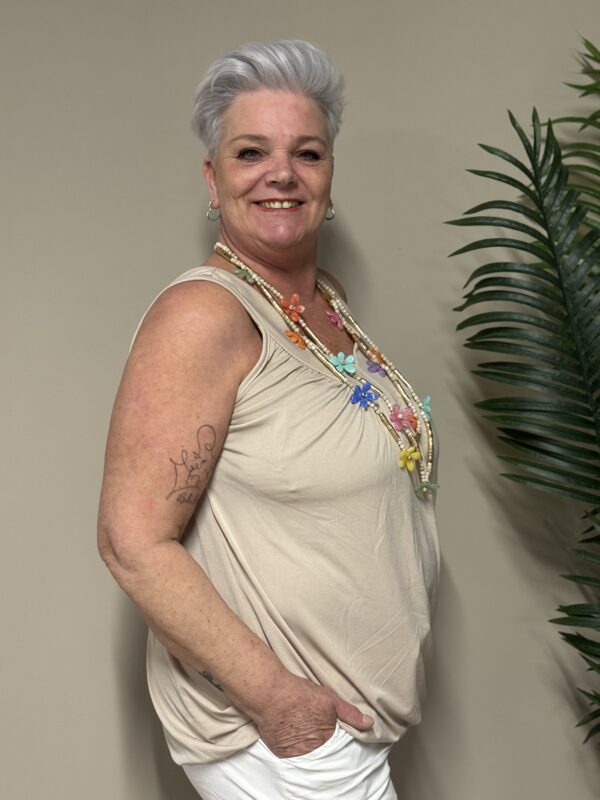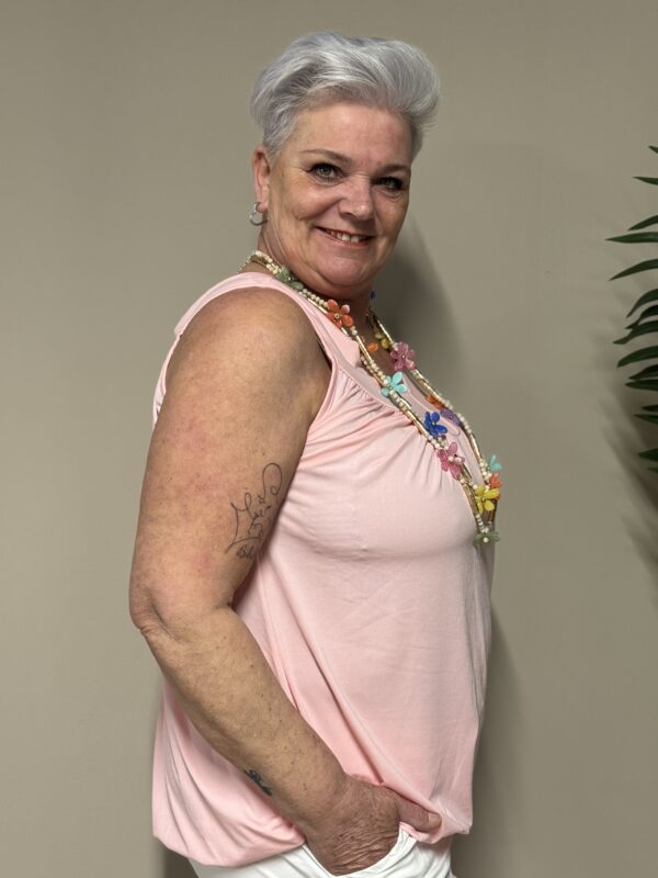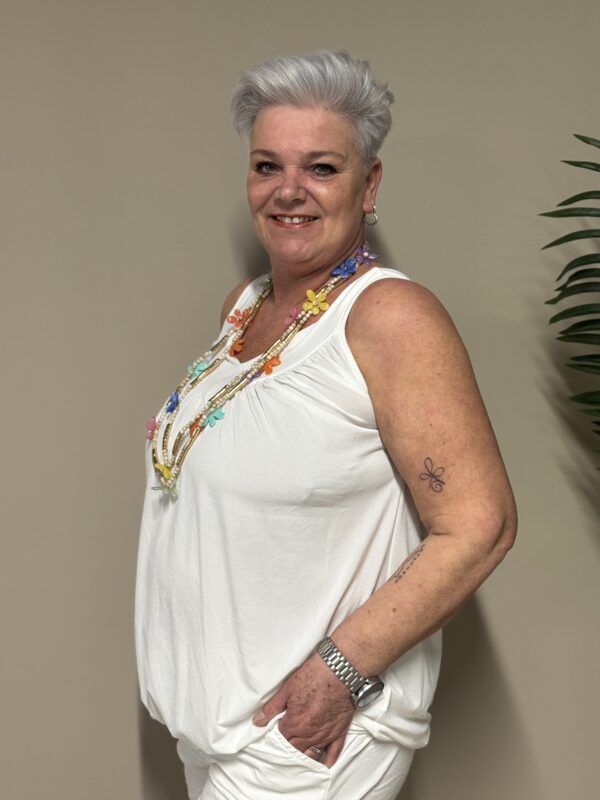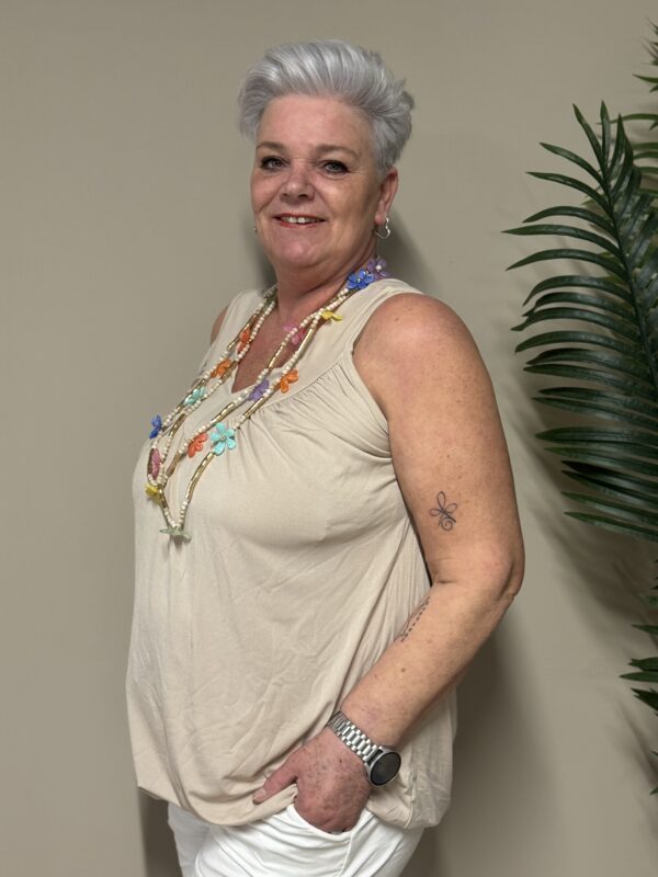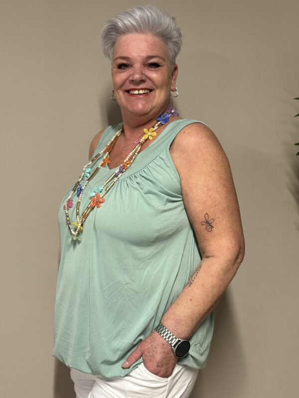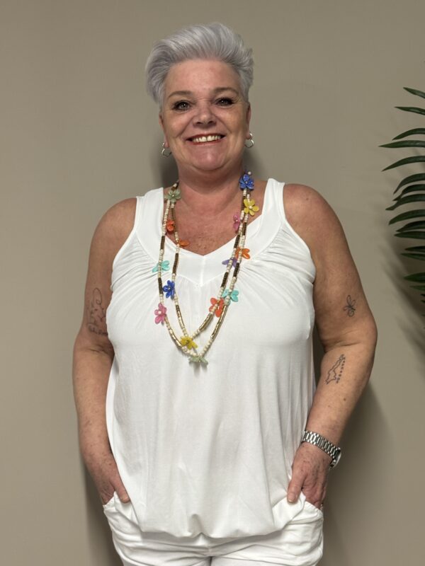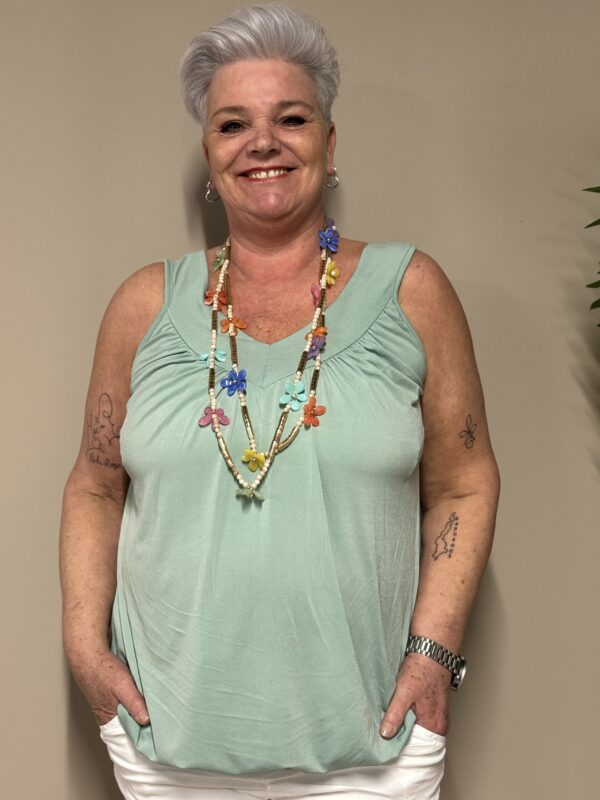 Dankzij het one size model is de top draagbaar tot en met maat 48/50. De losse pasvorm zorgt ervoor dat hij comfortabel zit zonder strak aan te sluiten.