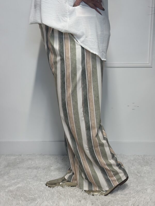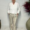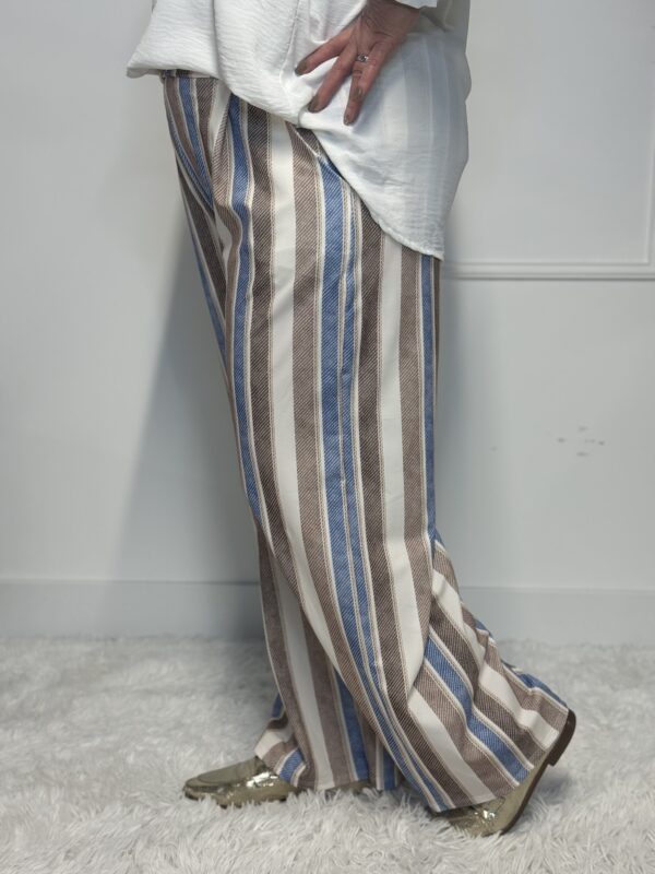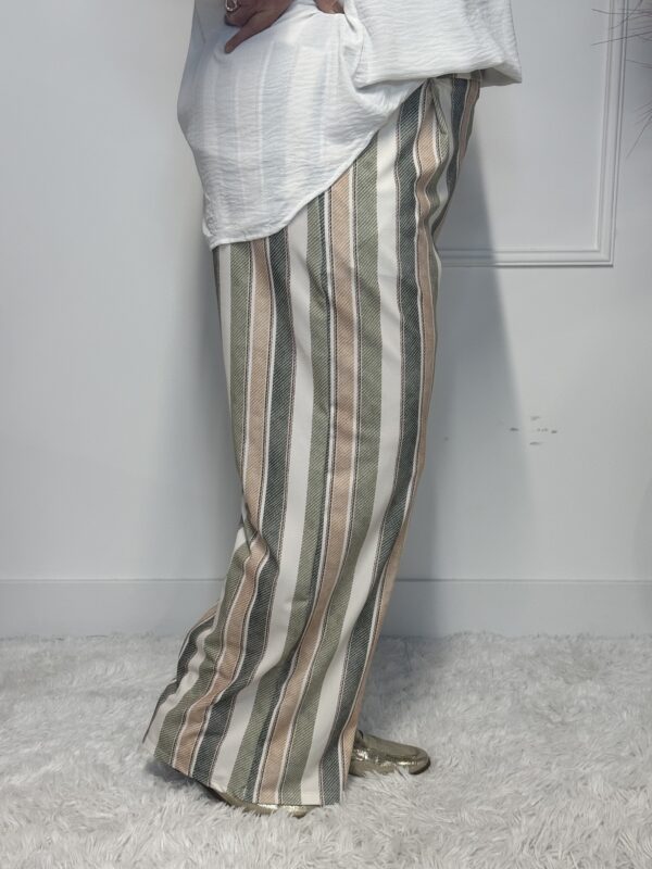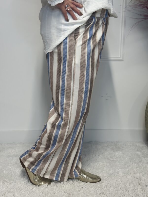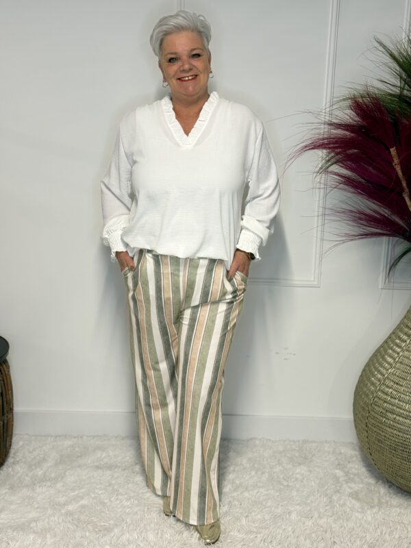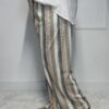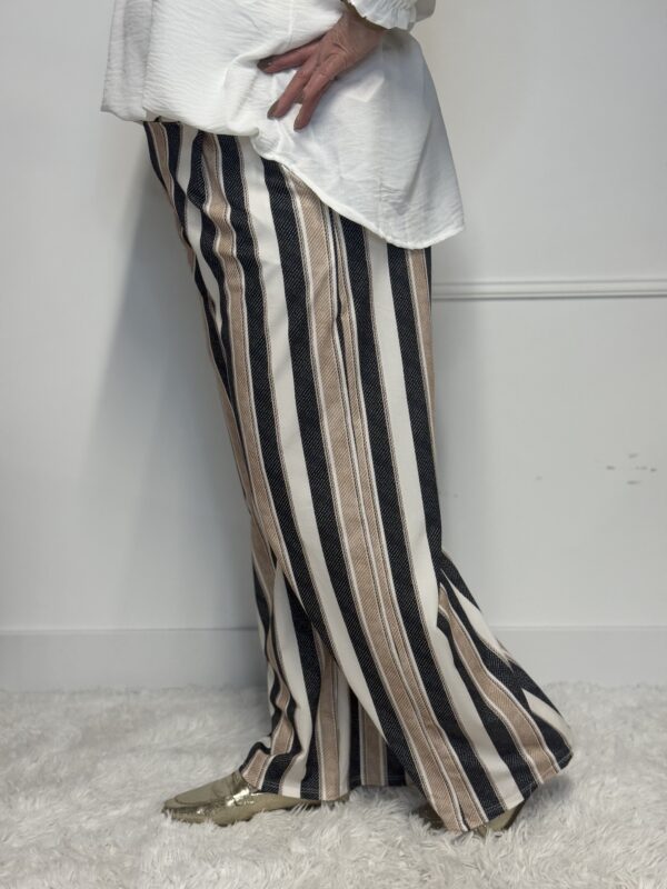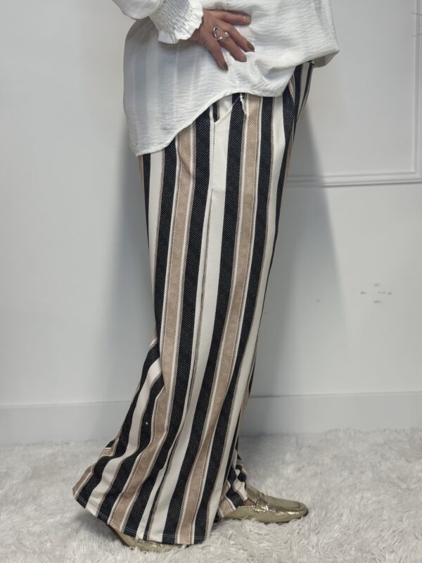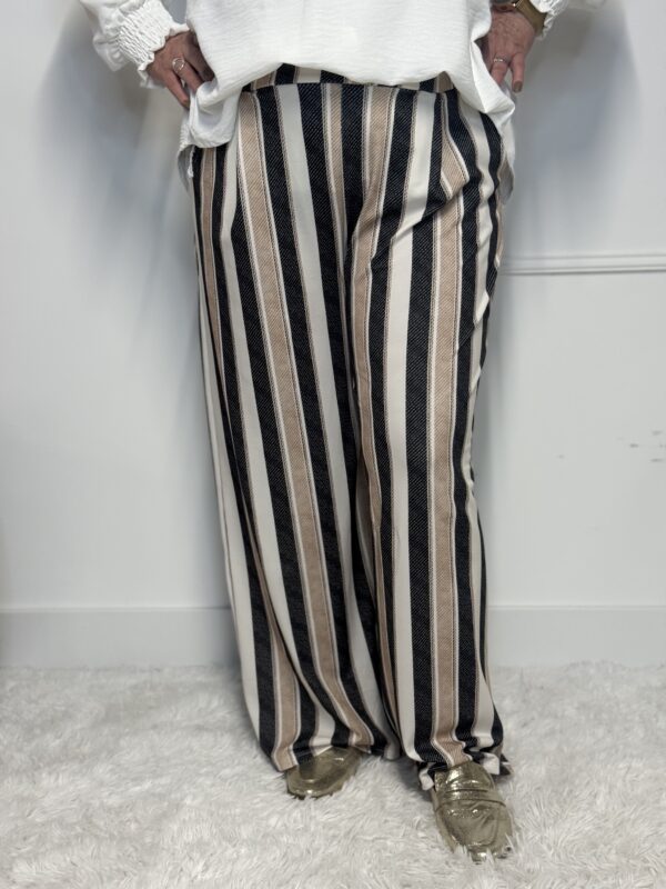 Deze trendy palazzo broek met streepprint is de perfecte combinatie van comfort en stijl. De wijde pijpen en soepel vallende stof zorgen voor een elegante, flatterende look én heerlijk draagcomfort. Ideaal voor zowel een casual outfit als een geklede gelegenheid.