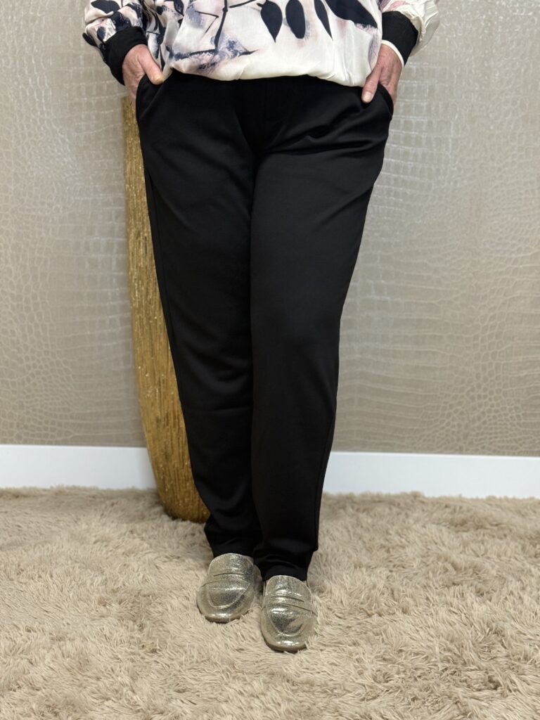 De pantalon is uitsluitend verkrijgbaar in de kleur zwart en beschikbaar in de maten 42/44, 46/48, 50/52 en 54/56. De soepele stof met stretch valt mooi om het lichaam en biedt optimale bewegingsvrijheid, ideaal voor dagelijks gebruik.