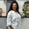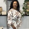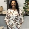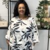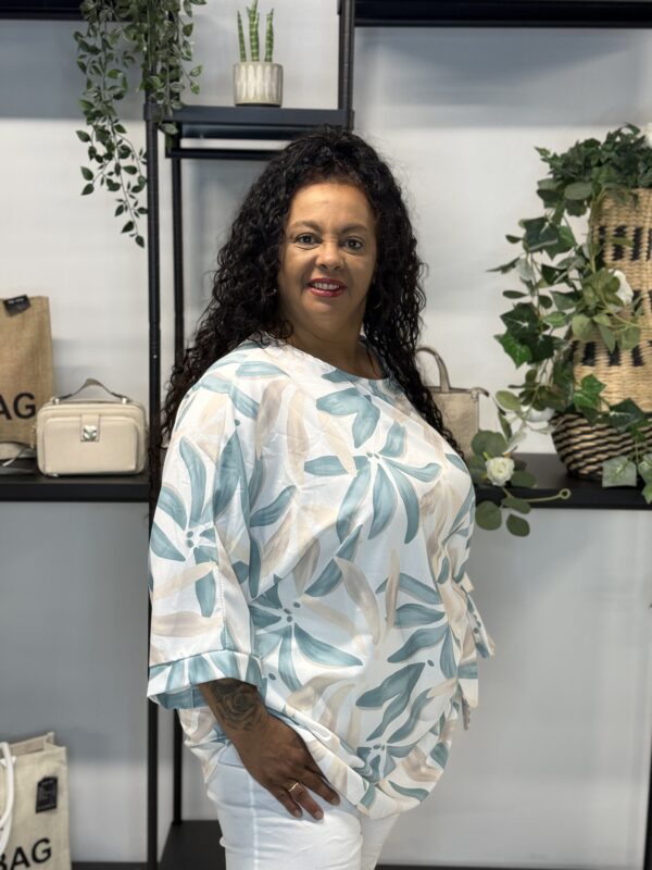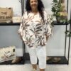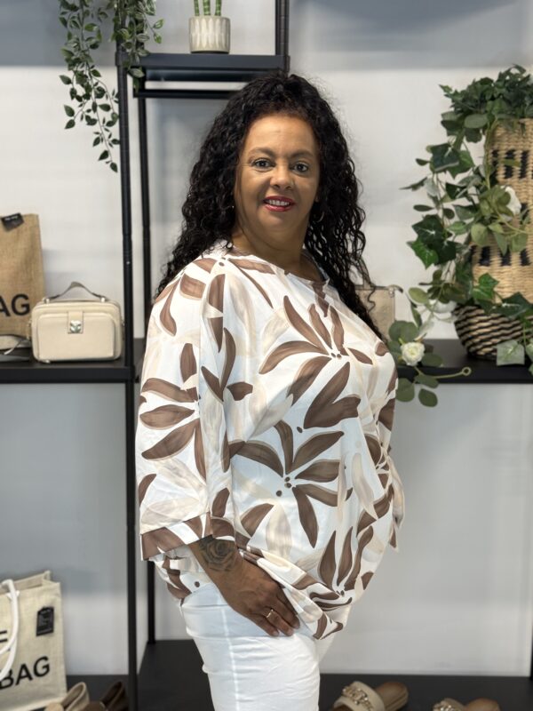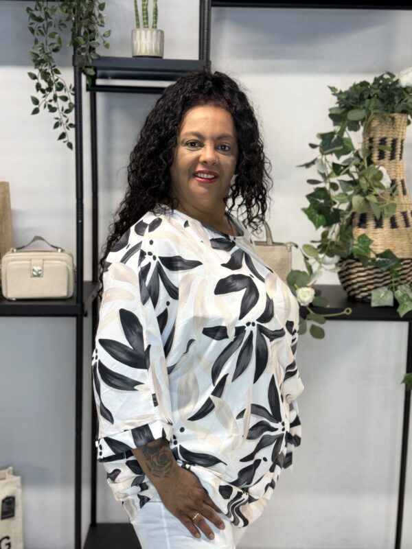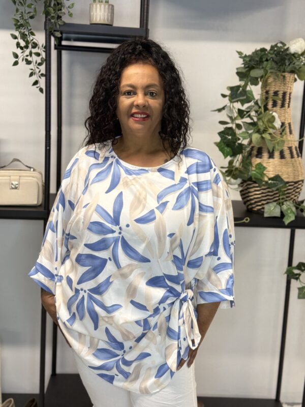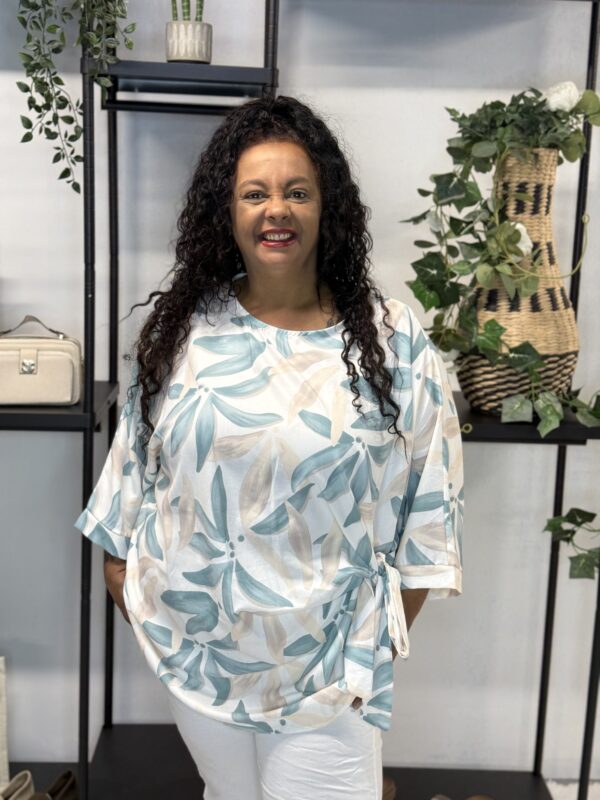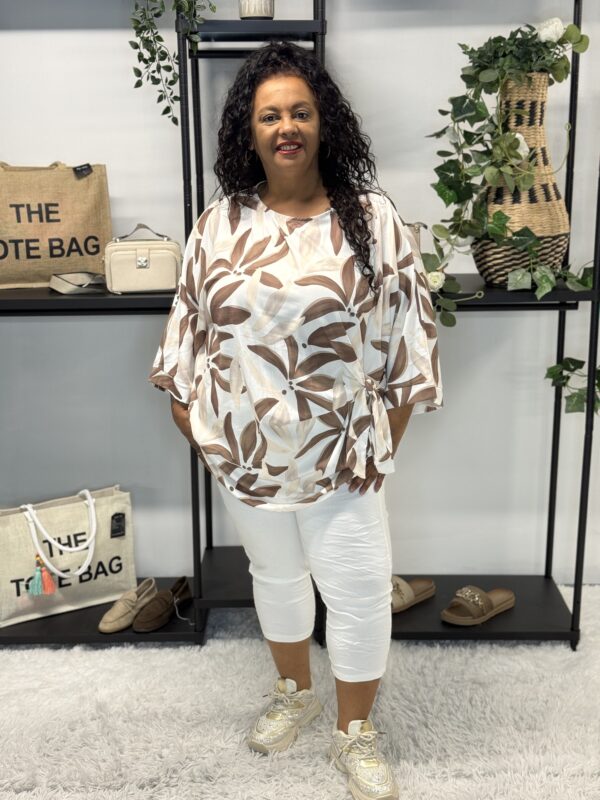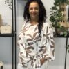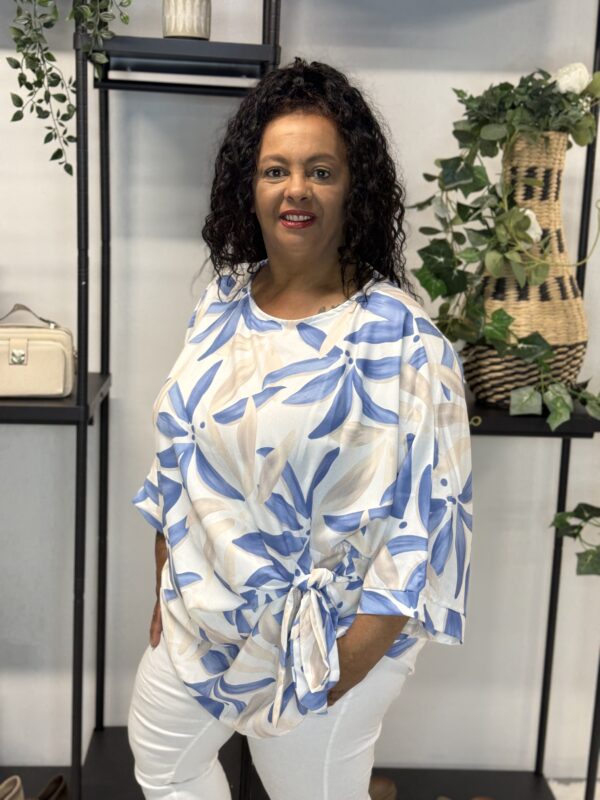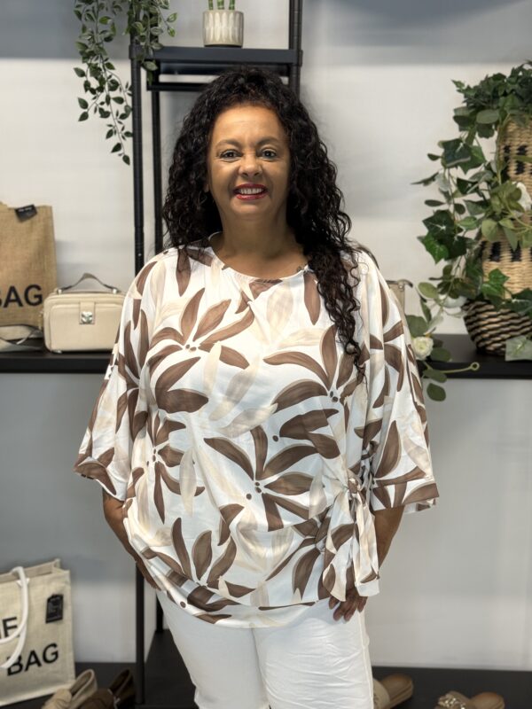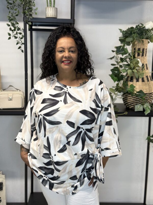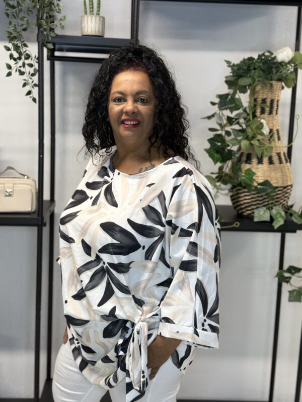 Dit shirt met abstracte bladprint en strikdetail aan de zijkant geeft jouw outfit een moderne en vrouwelijke uitstraling 💖 De unieke print en het speelse detail maken dit item een echte eyecatcher!