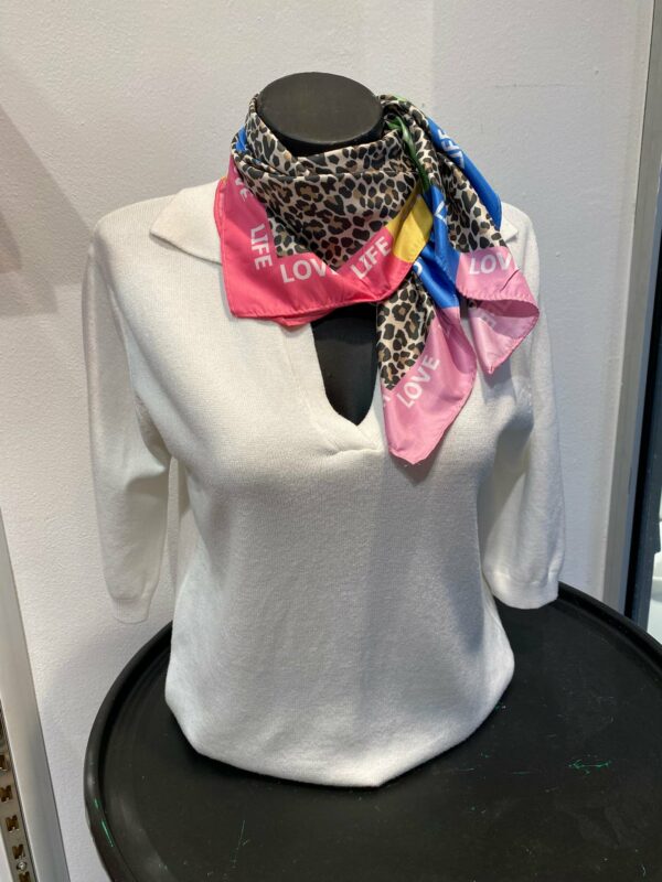 Deze korte sjaal met de tekst “Love Life” geeft je outfit een vrolijk en modieus accent. Gemaakt van 100% polyester, voelt de sjaal licht en soepel aan en is hij perfect om los te dragen of elegant om de hals te knopen.