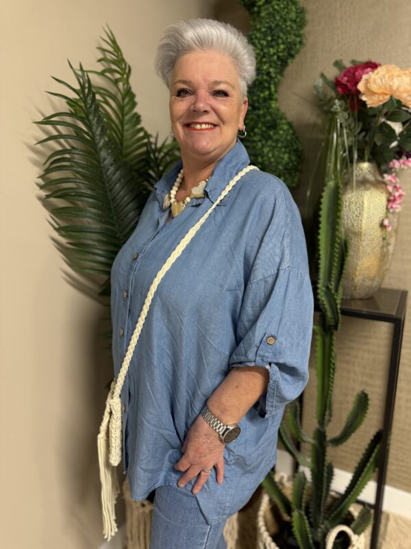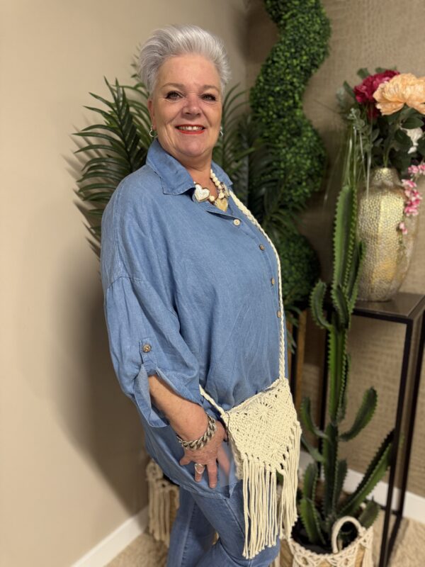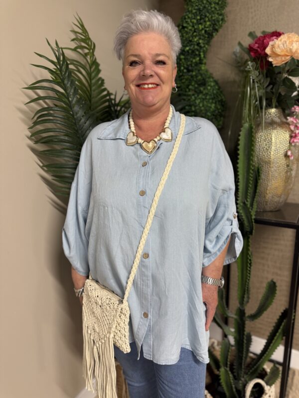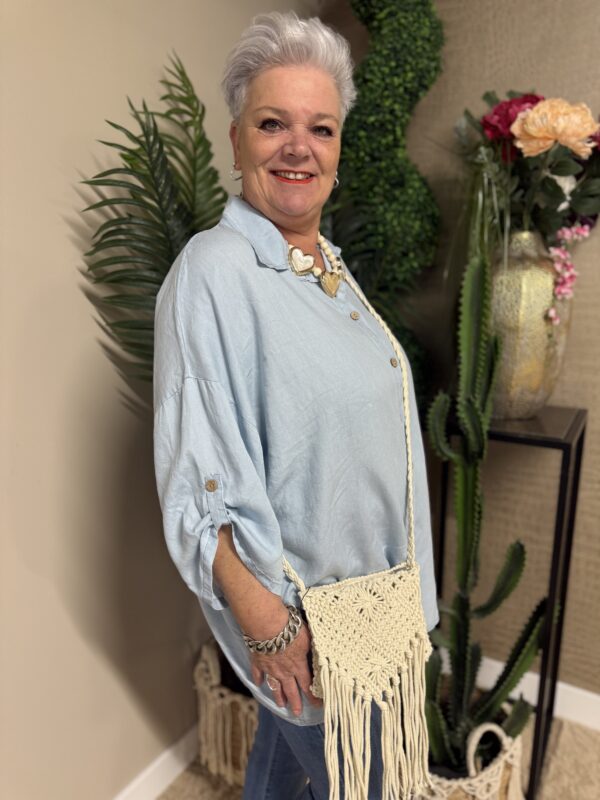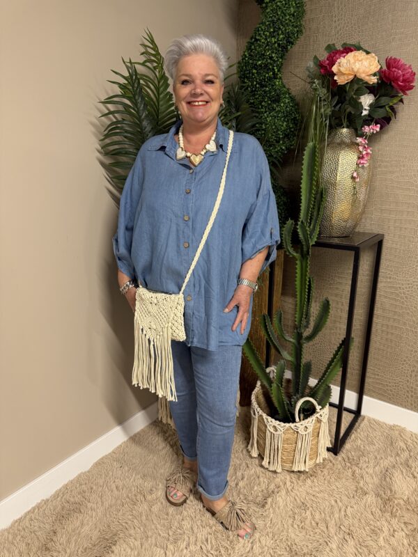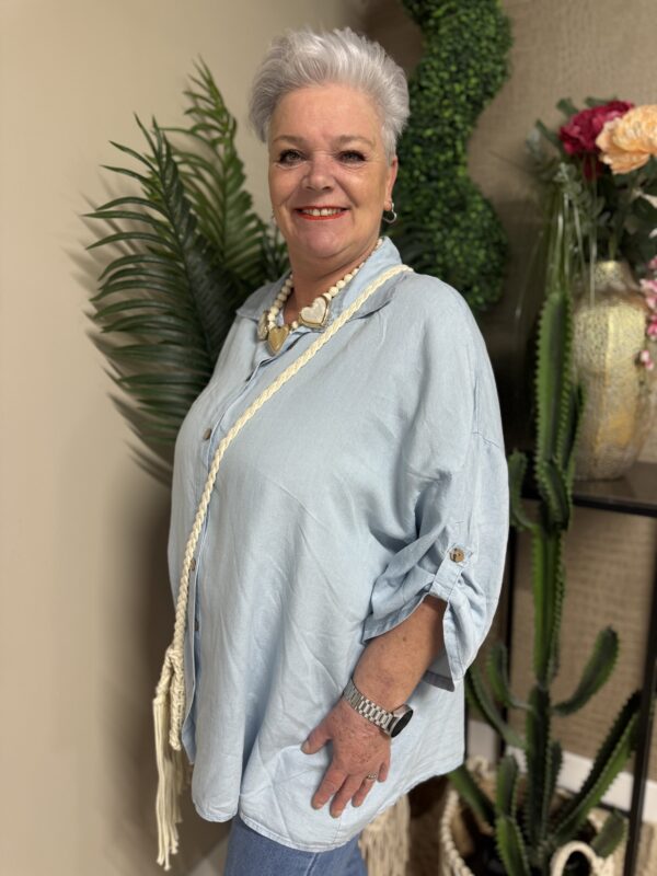 Dankzij het one size model is de blouse draagbaar tot en met maat 50/52. De losse pasvorm zorgt ervoor dat hij mooi valt zonder strak te zitten. Verkrijgbaar in licht spijker en donker spijker, zodat je altijd een variant vindt die bij jouw stijl past ✨