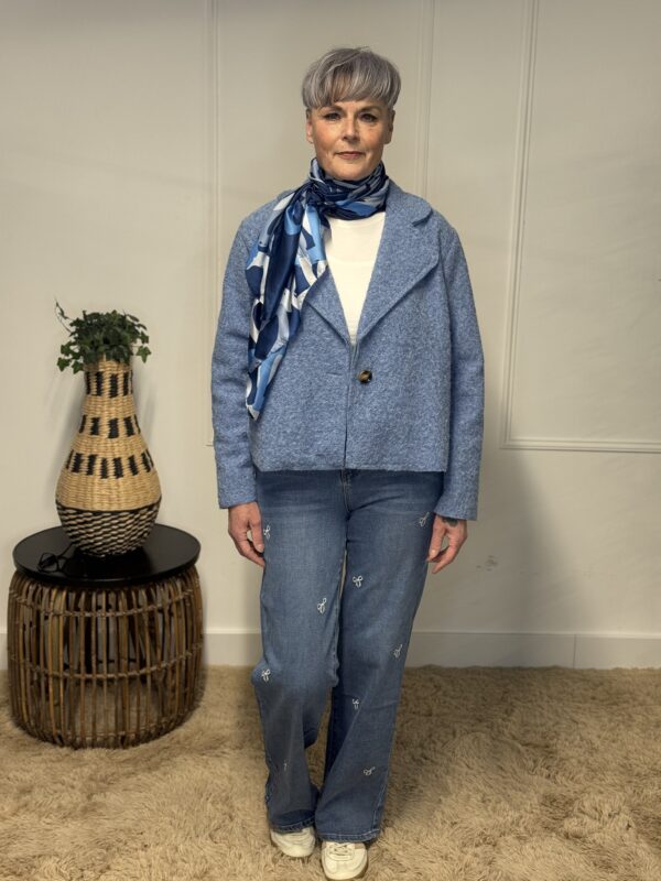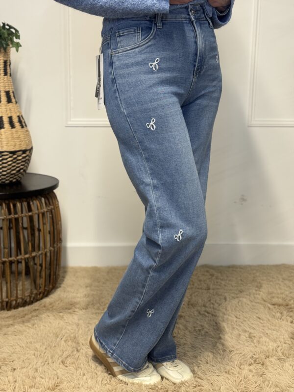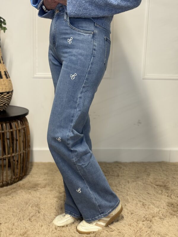 Geef je outfit een speelse en stijlvolle uitstraling met deze wide leg spijkerbroek met geborduurde strikjes. De broek heeft een moderne, wijde pasvorm die soepel langs het been valt en zorgt voor een flatterend silhouet. De subtiele borduursels in de vorm van strikjes geven de jeans een verfijnde en vrouwelijke touch.