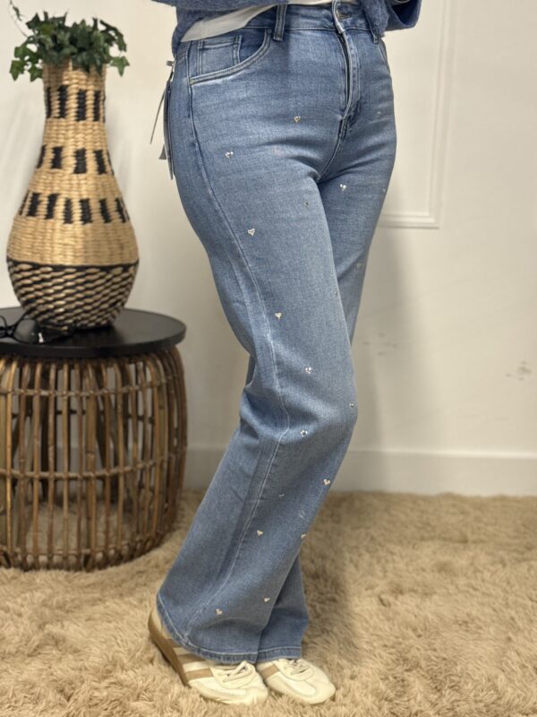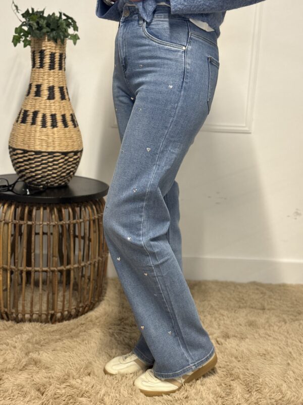 Geef je outfit een speelse en trendy uitstraling met deze wide leg spijkerbroek met hartjesprint. De broek heeft een moderne, wijde pasvorm die soepel langs het been valt en zorgt voor een flatterend silhouet. De subtiele hartjesdetails geven de jeans een unieke en vrouwelijke touch – perfect om je look net dat beetje extra te geven.