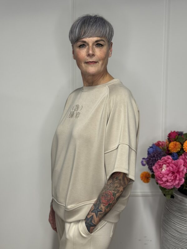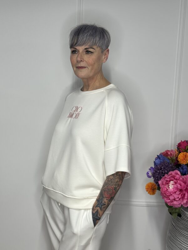 Deze sweater met de tekst “Ciao” combineert comfort met een vrolijke, casual uitstraling. Gemaakt van zachte, comfortabele stof die heerlijk draagt, ideaal voor dagelijks gebruik. Dankzij het one size model is de sweater draagbaar tot en met maat 40/42.