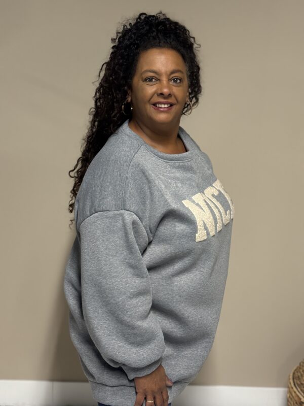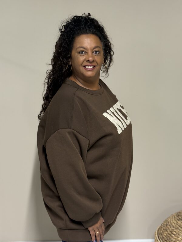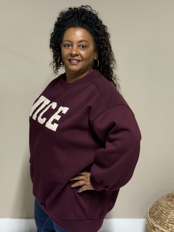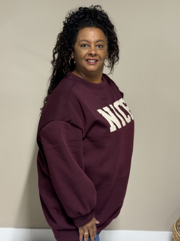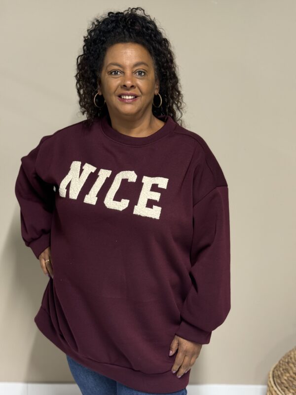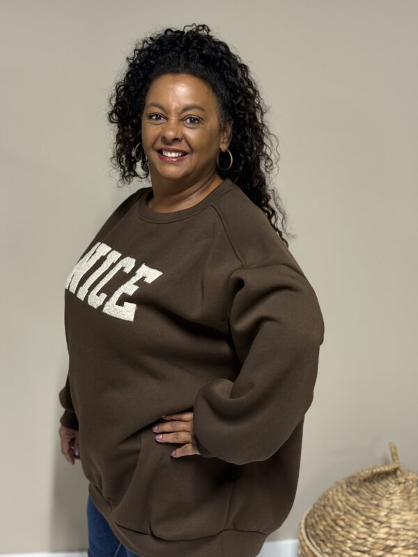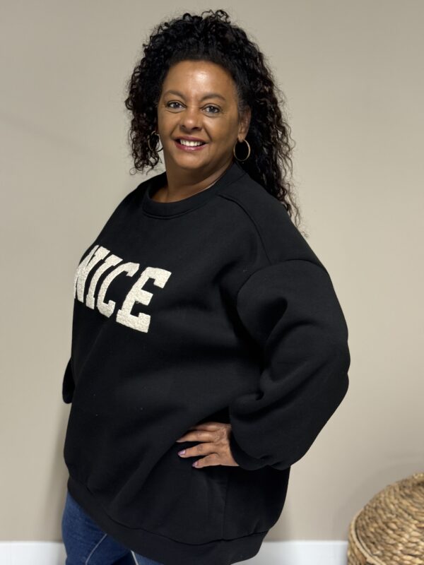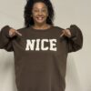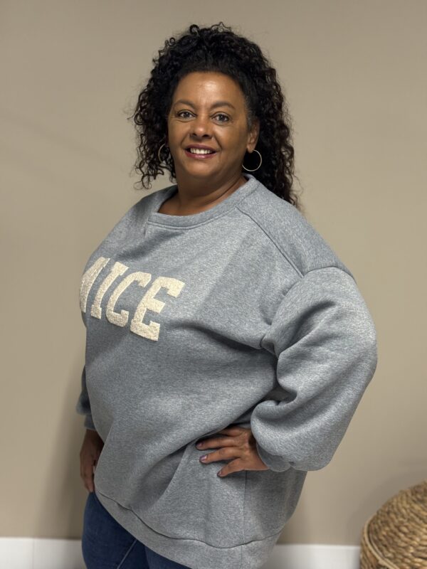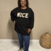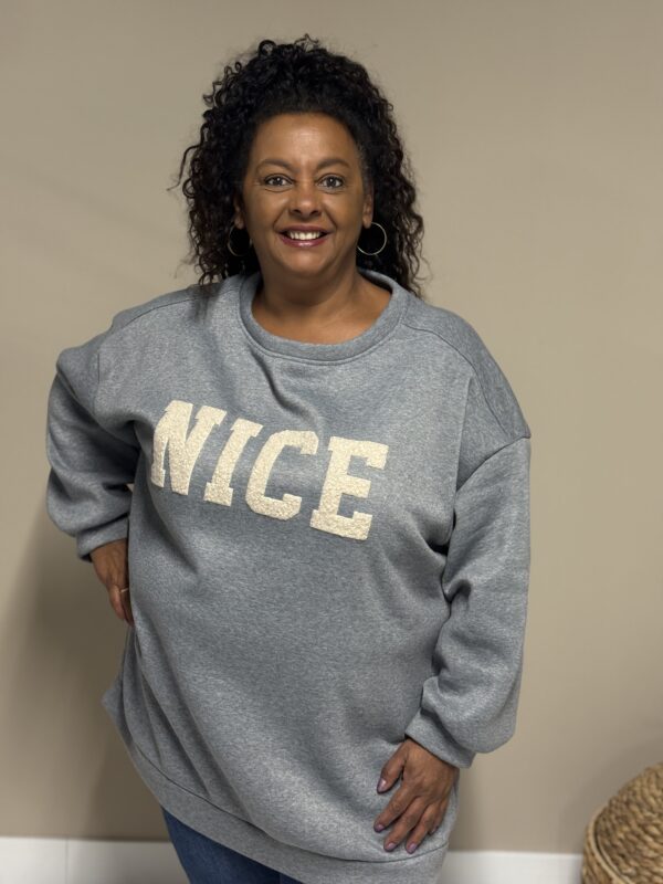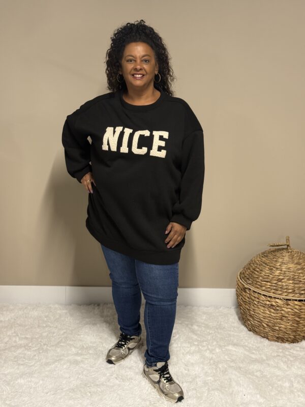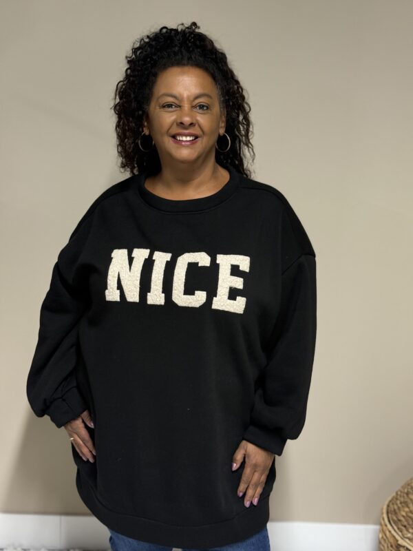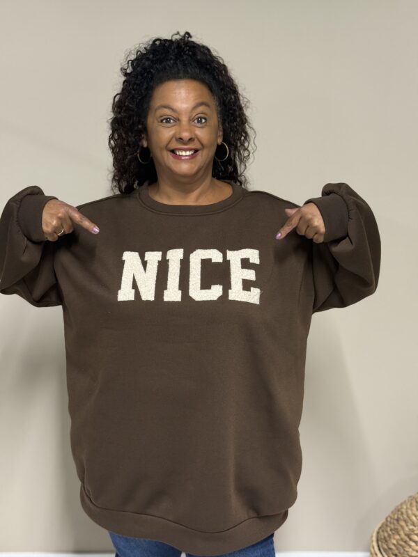 Deze trendy sweater met de tekst “Nice” is de perfecte mix van stijl en comfort!