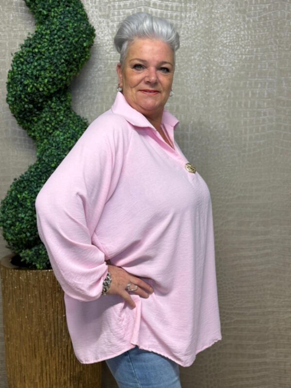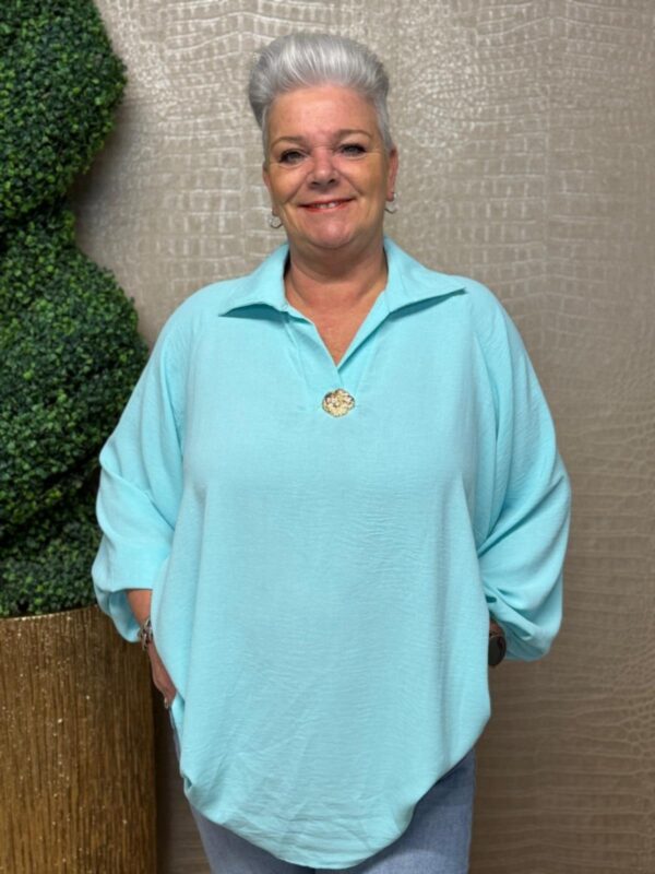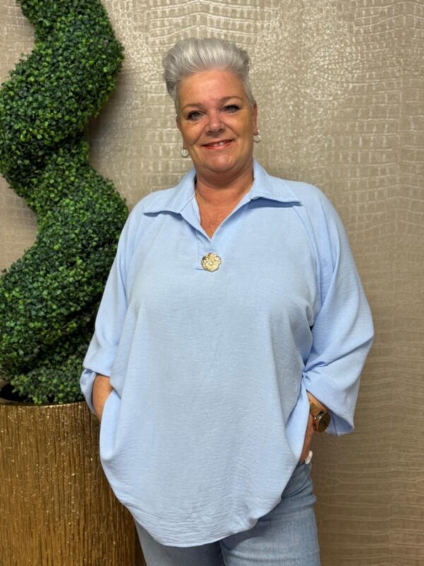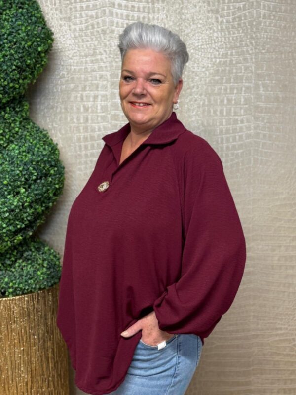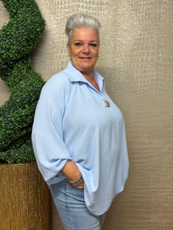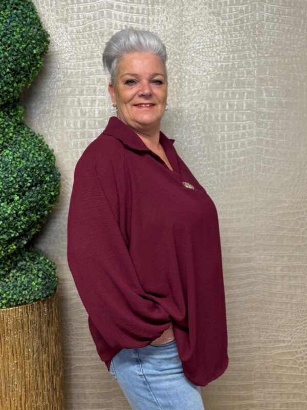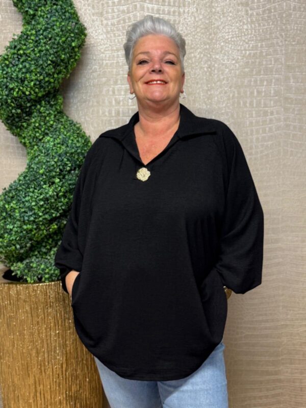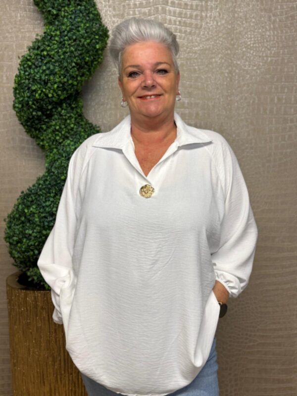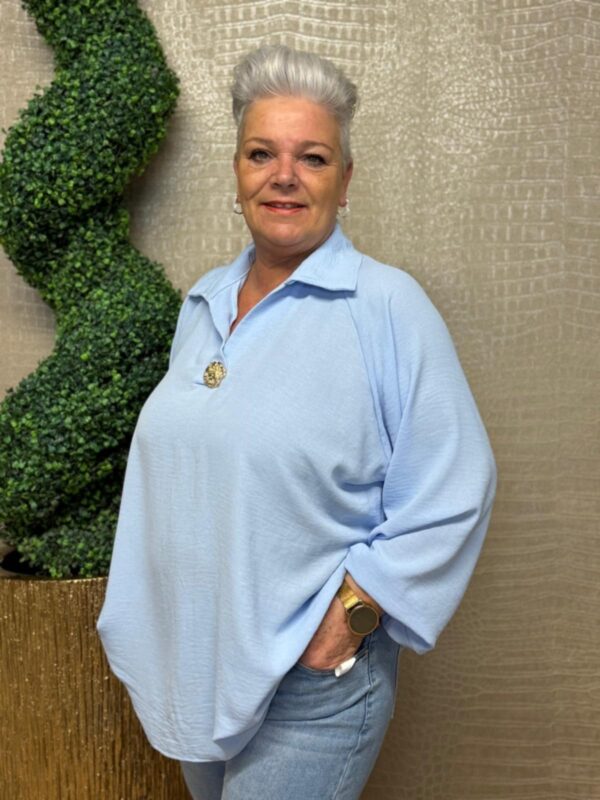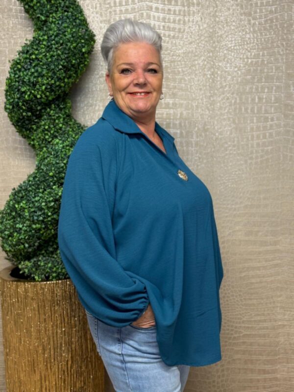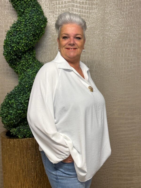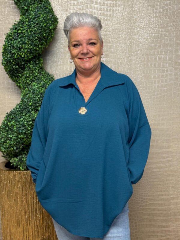Deze top met V-hals en kraag straalt pure klasse uit! De gouden broche aan de voorkant geeft een luxe touch, terwijl de soepelvallende stof zorgt voor een elegante pasvorm. Dankzij het one size model, geschikt tot en met maat 50/52, zit de top mooi en comfortabel.