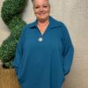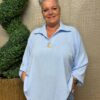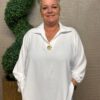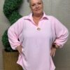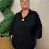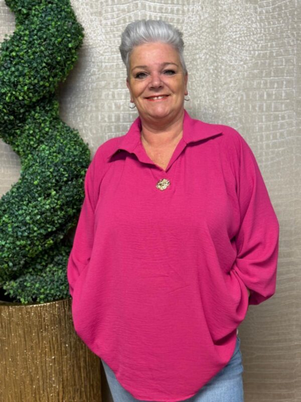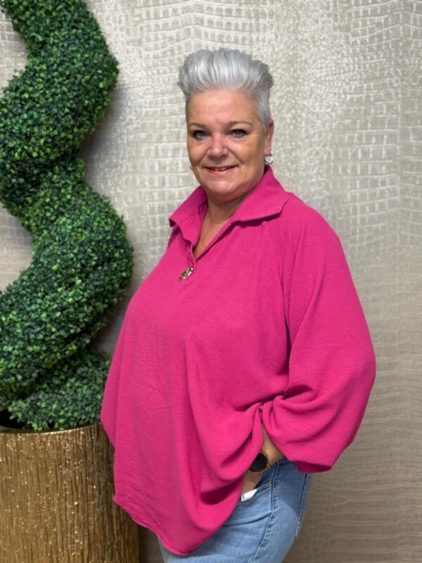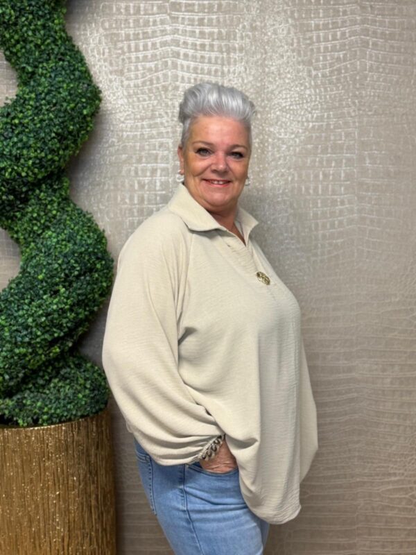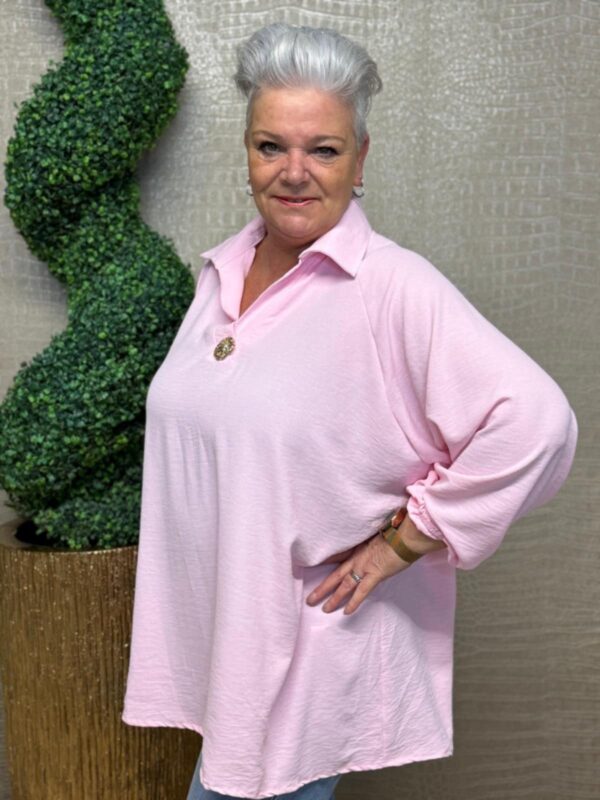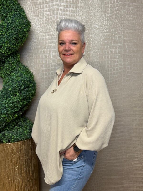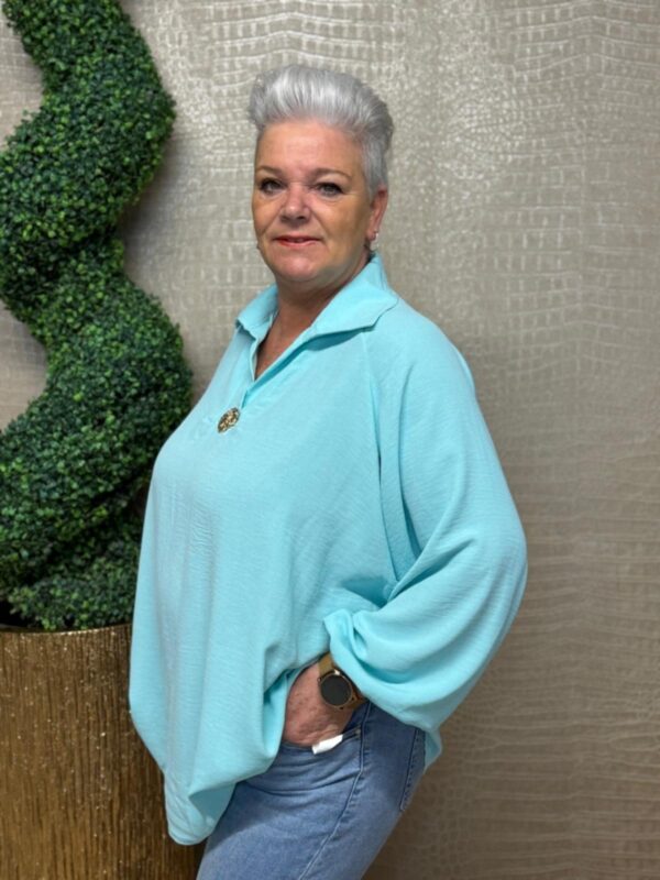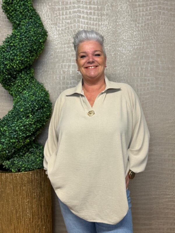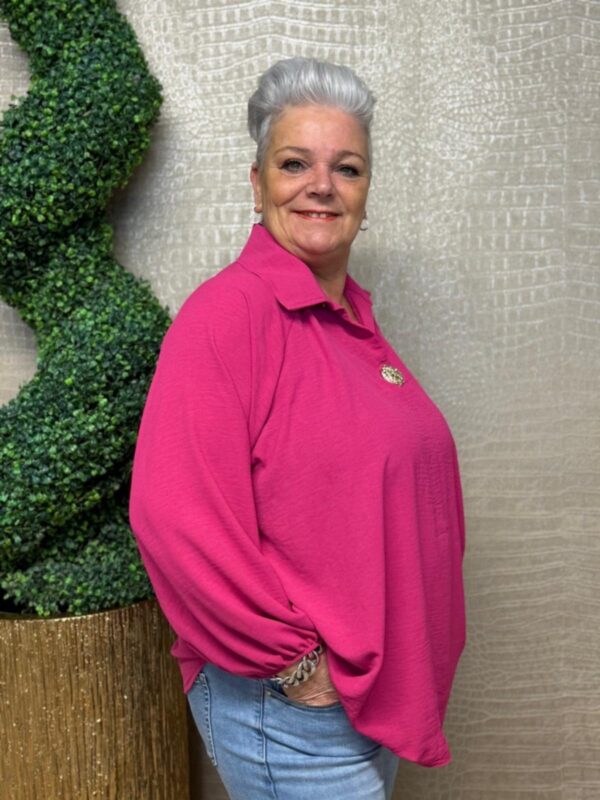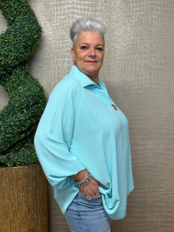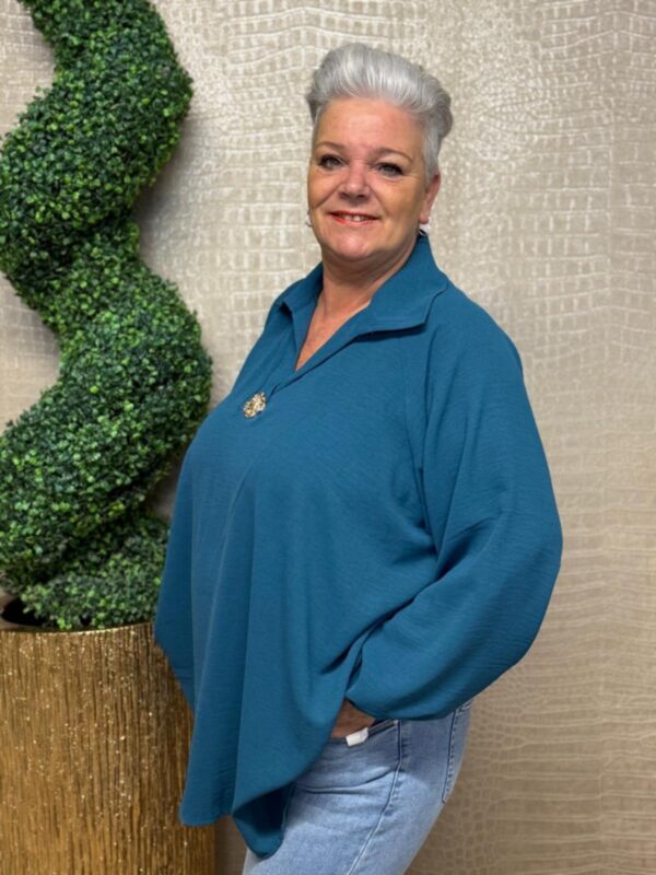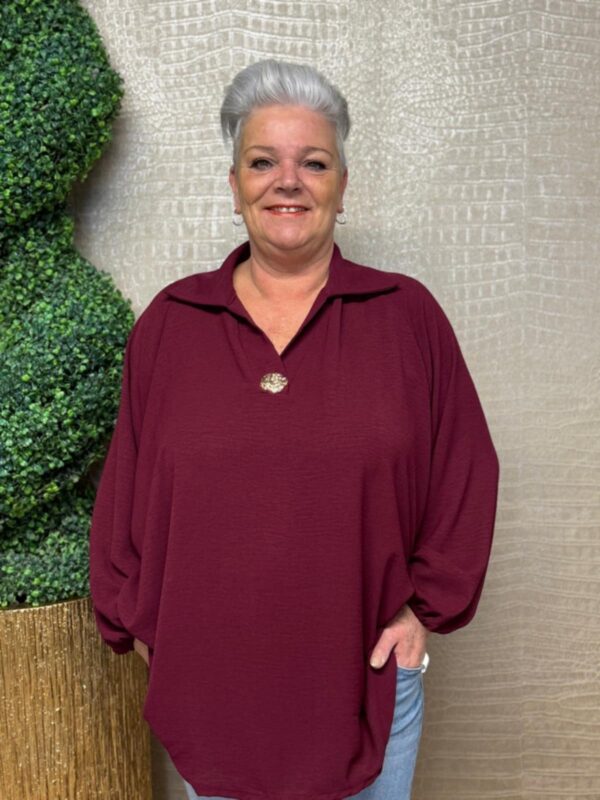 Deze top met V-hals en kraag straalt pure klasse uit! De gouden broche aan de voorkant geeft een luxe touch, terwijl de soepelvallende stof zorgt voor een elegante pasvorm. Dankzij het one size model, geschikt tot en met maat 50/52, zit de top mooi en comfortabel.