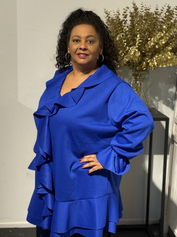 De top is verkrijgbaar in verschillende kleuren en heeft een ruime, comfortabele pasvorm. Het model is ƩƩn maat en kan gedragen worden tot en met maat 54/56. Dankzij de soepele stof met stretch valt de top mooi om het lichaam en draagt hij prettig gedurende de hele dag. Met een borstwijdte (oksel tot oksel) van ca. 87 cm en een lengte van ca. 82 cm biedt de top een flatterende fit.