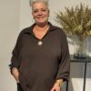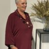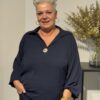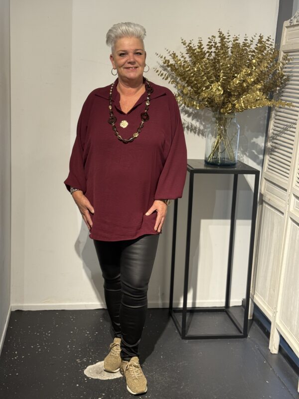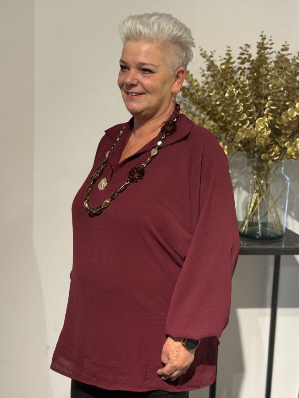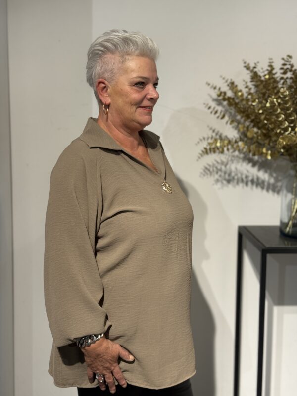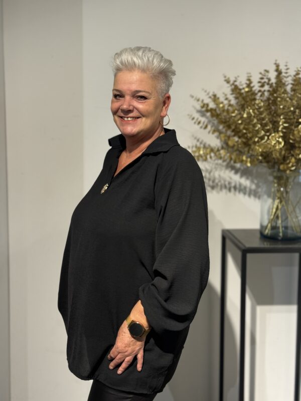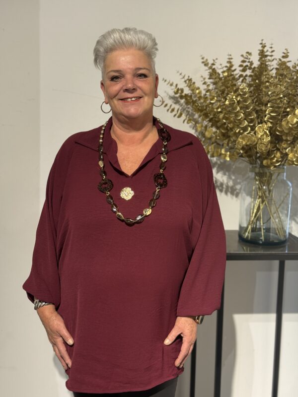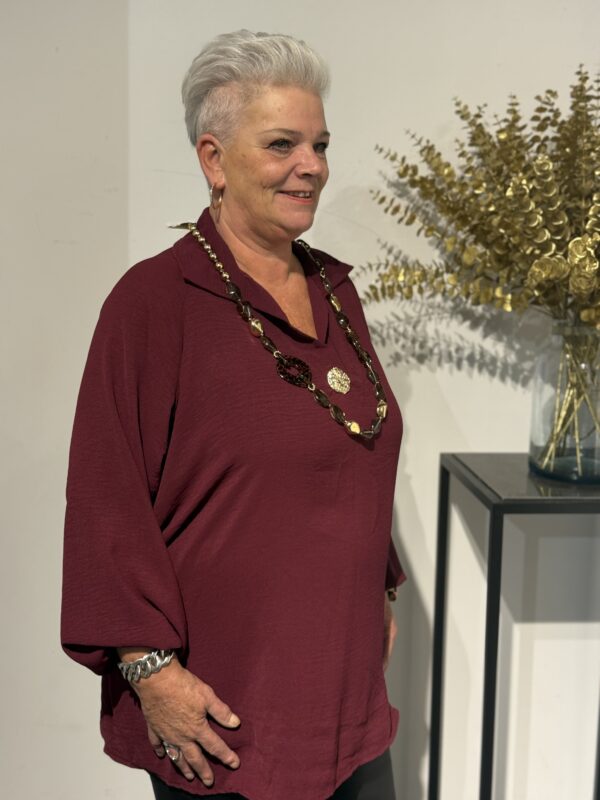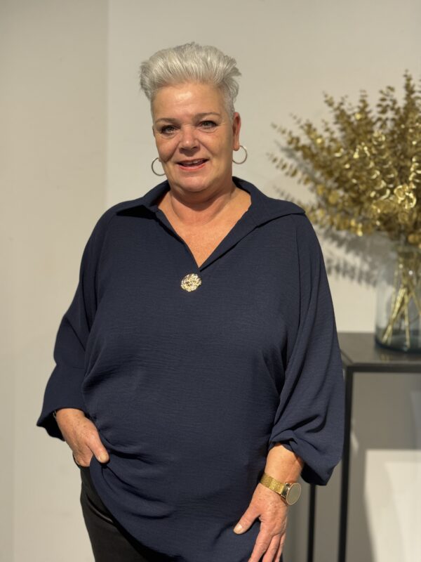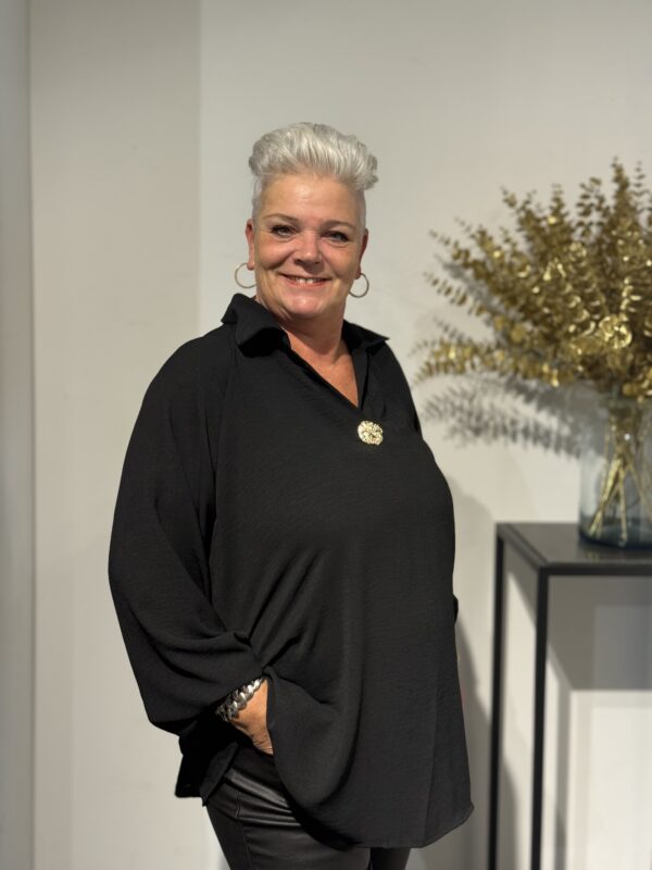 Deze top met V-hals en kraag straalt pure klasse uit! De gouden broche aan de voorkant geeft een luxe touch, terwijl de soepelvallende stof zorgt voor een elegante pasvorm. Dankzij het one size model, geschikt tot en met maat 50/52, zit de top mooi en comfortabel.