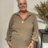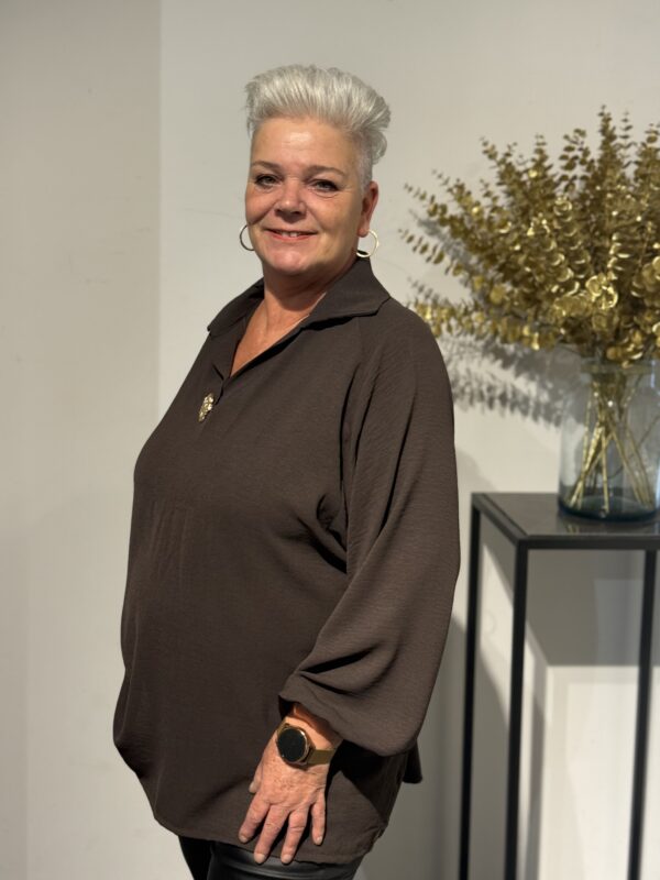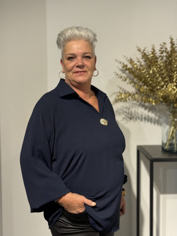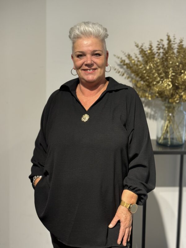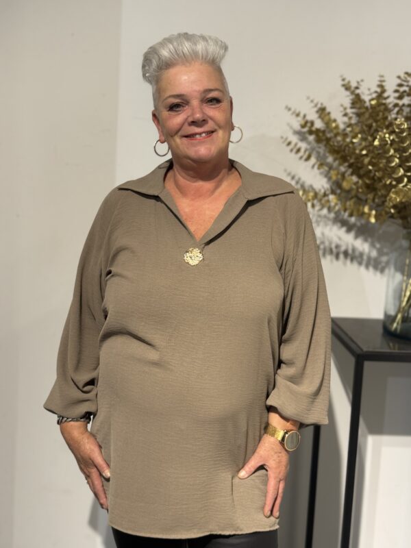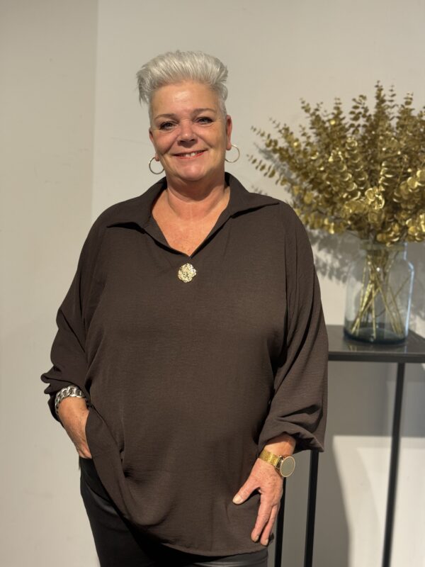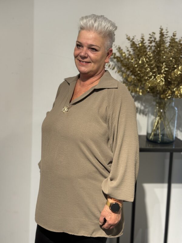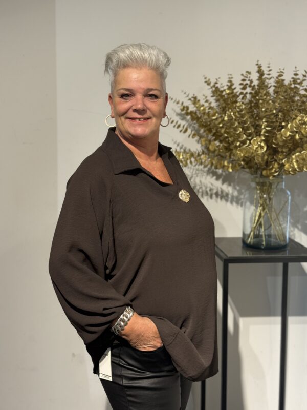 💛 Top met V-hals, kraag & gouden broche – elegant, stijlvol & one size 💛