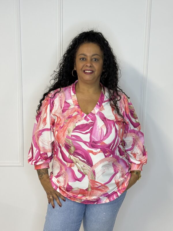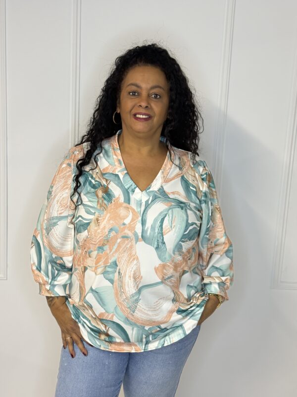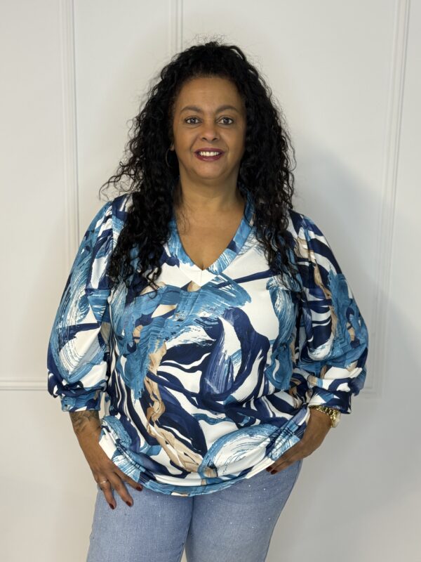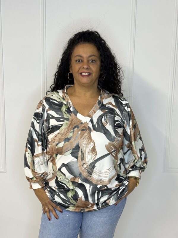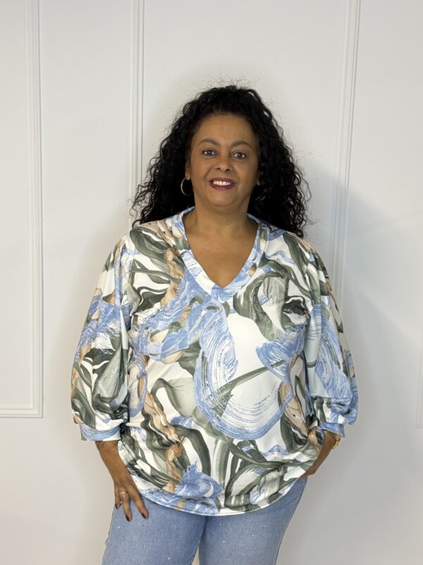 Deze stijlvolle top met V-hals en print is een perfecte combinatie van comfort en een modieuze uitstraling. De top heeft een vrouwelijke V-hals en een speelse print, waardoor hij een frisse en trendy look krijgt. Dankzij de fijne pasvorm valt de top mooi en draagt hij comfortabel.