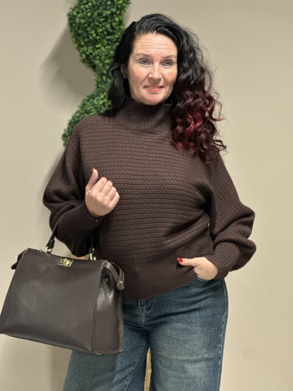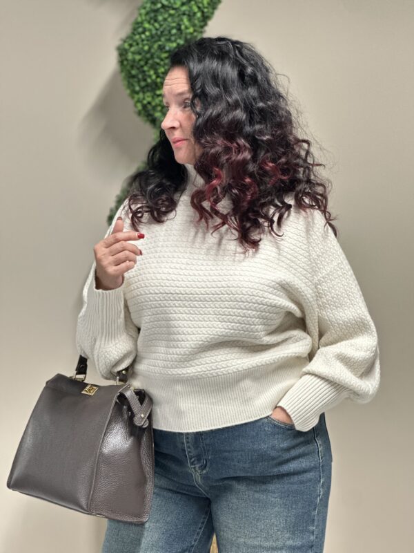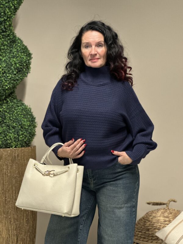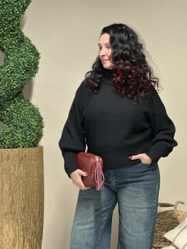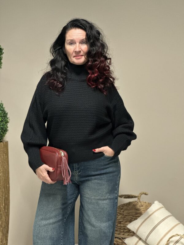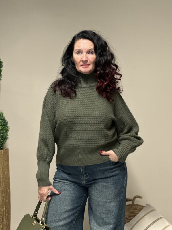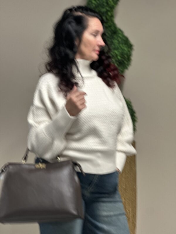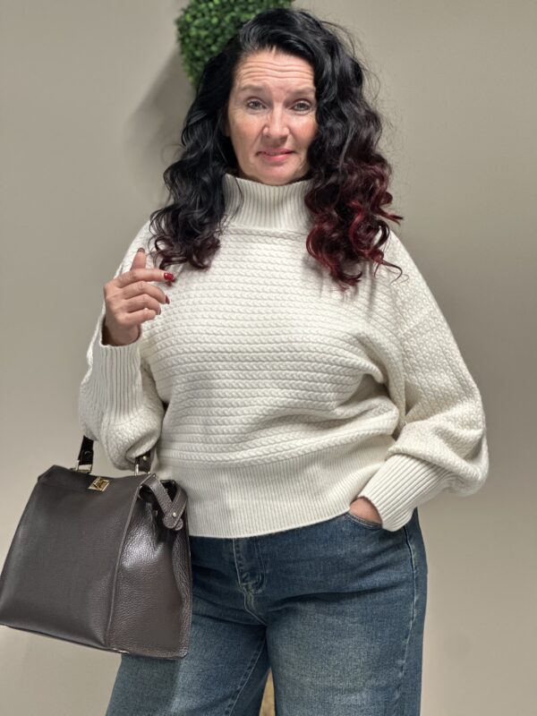 Deze trui is een echte must-have voor je garderobe. De korte turtle neck geeft een moderne, minimalistische uitstraling en zorgt tegelijk voor een extra warmte zonder zwaar aan te voelen. Dankzij de zachte stof en comfortabele pasvorm draag je deze trui moeiteloos zowel casual als gekleed. Deze trui is één maat kan gedragen worden t/m maat 44