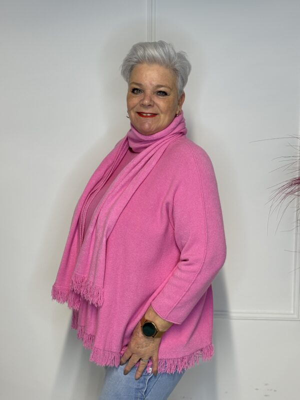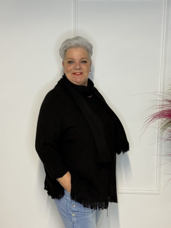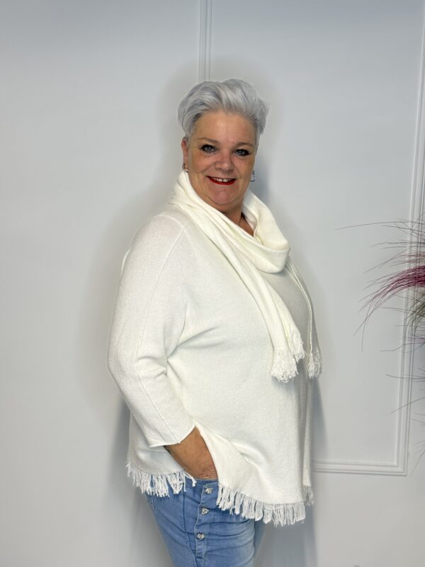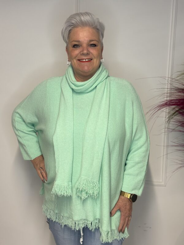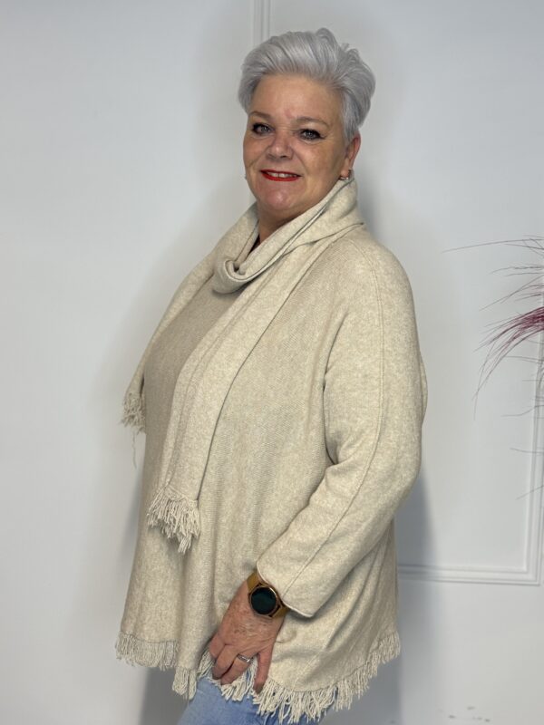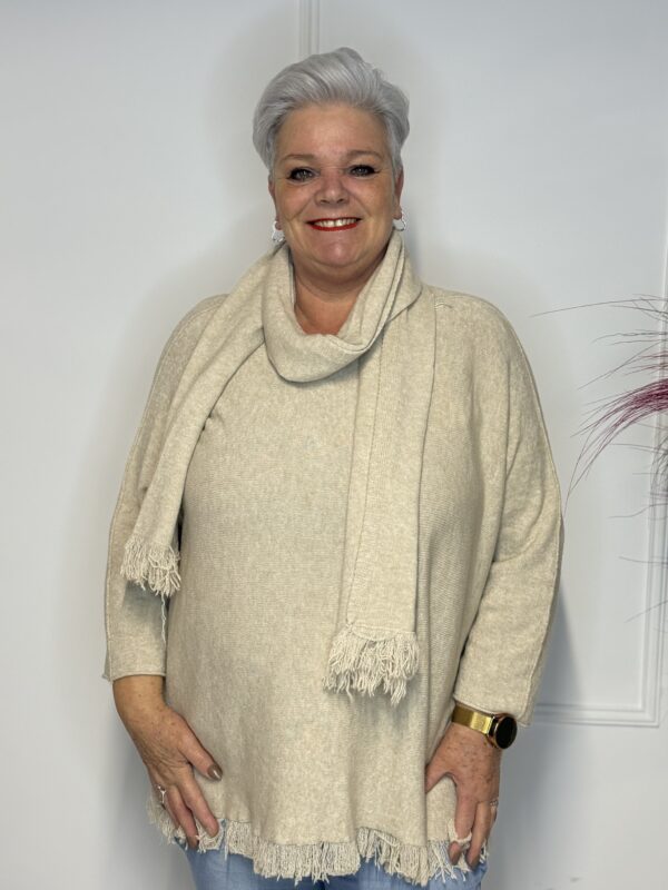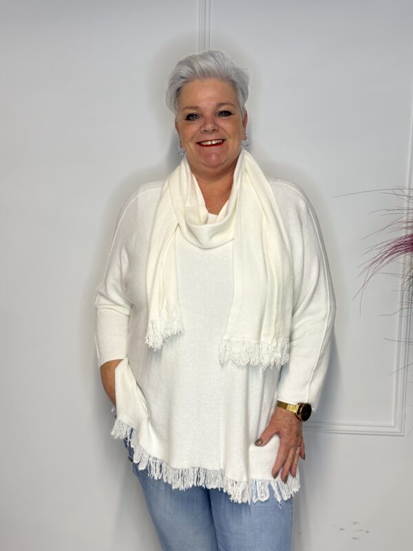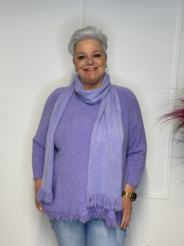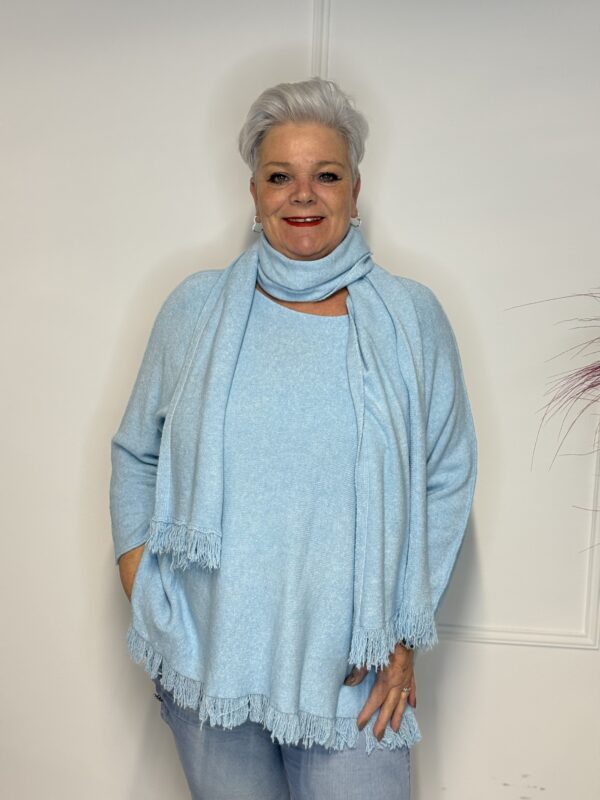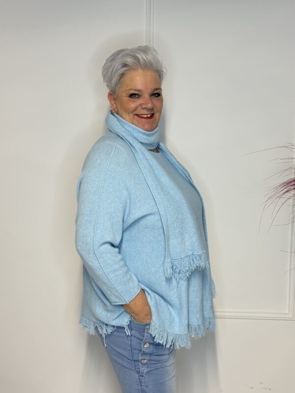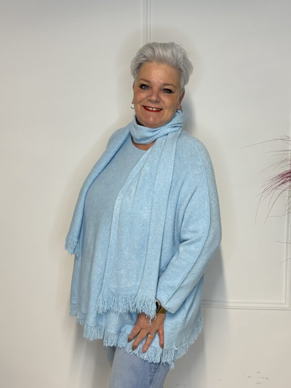 Deze elegante trui met speelse vlindermouwen geeft je outfit direct een vrouwelijke en moderne uitstraling. De bijpassende sjaal maakt de look helemaal af en zorgt voor extra warmte én stijl. Perfect voor zowel casual als geklede outfits.