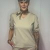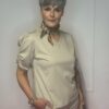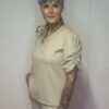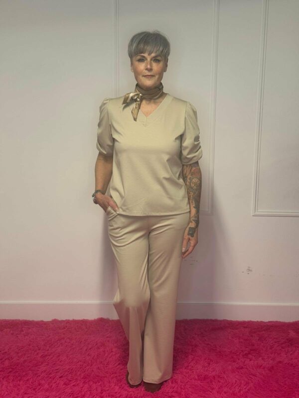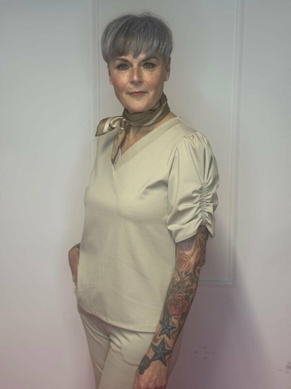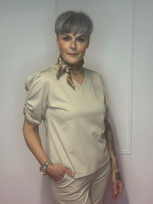 Elegant en vrouwelijk: deze uni top met V-hals en speelse pofmouwen is perfect voor zowel casual als nette looks. Gemaakt van een comfortabele mix van 52% viscose, 42% nylon en 6% elastan voor een zachte feel en lichte stretch.